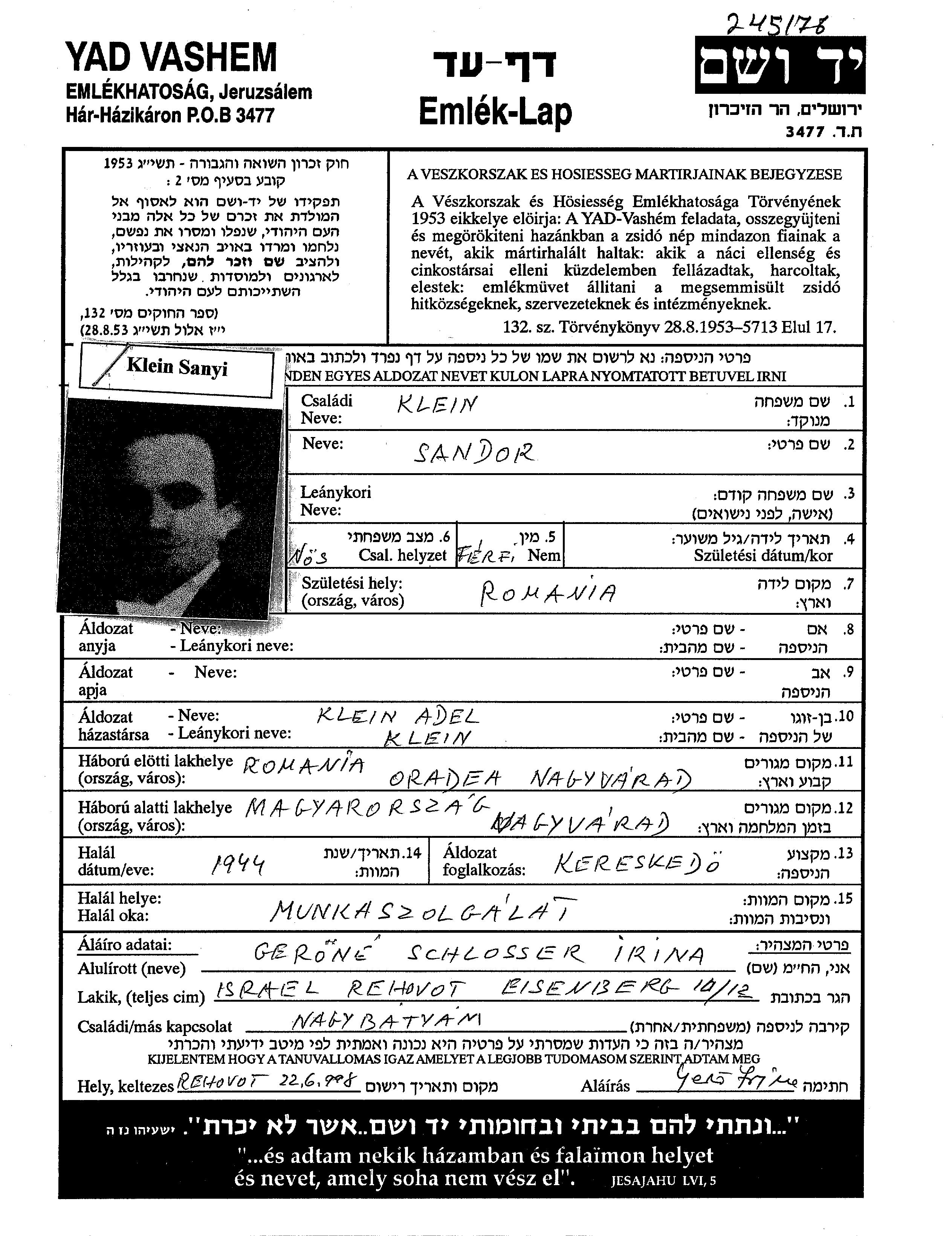 Клейн Сандор Надьварад, Румыния Лист свидетельских показаний