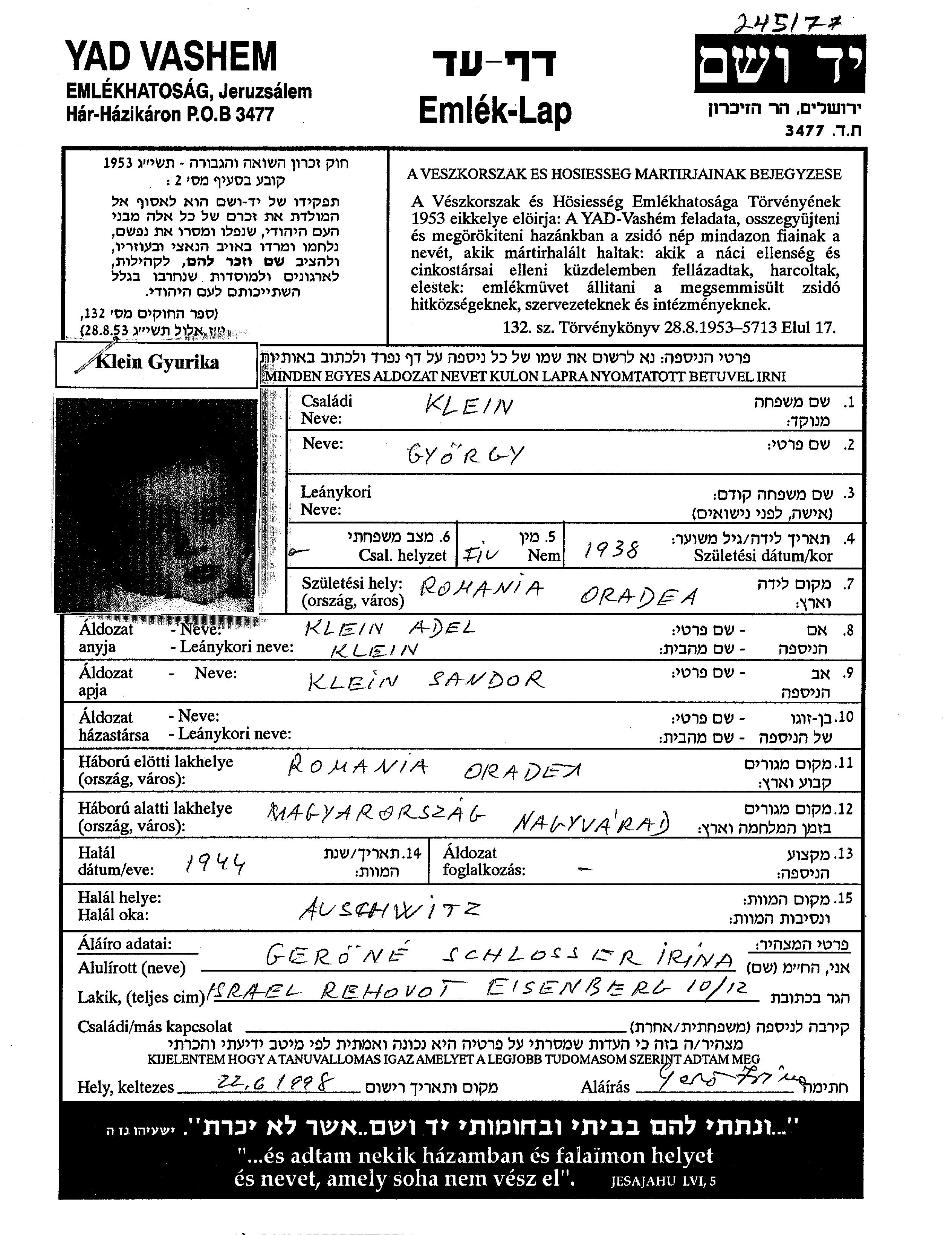 Дьёрдь Клейн, место рождения: Орадя, Румыния. Место жительства до войны: Орадя, Румыния.