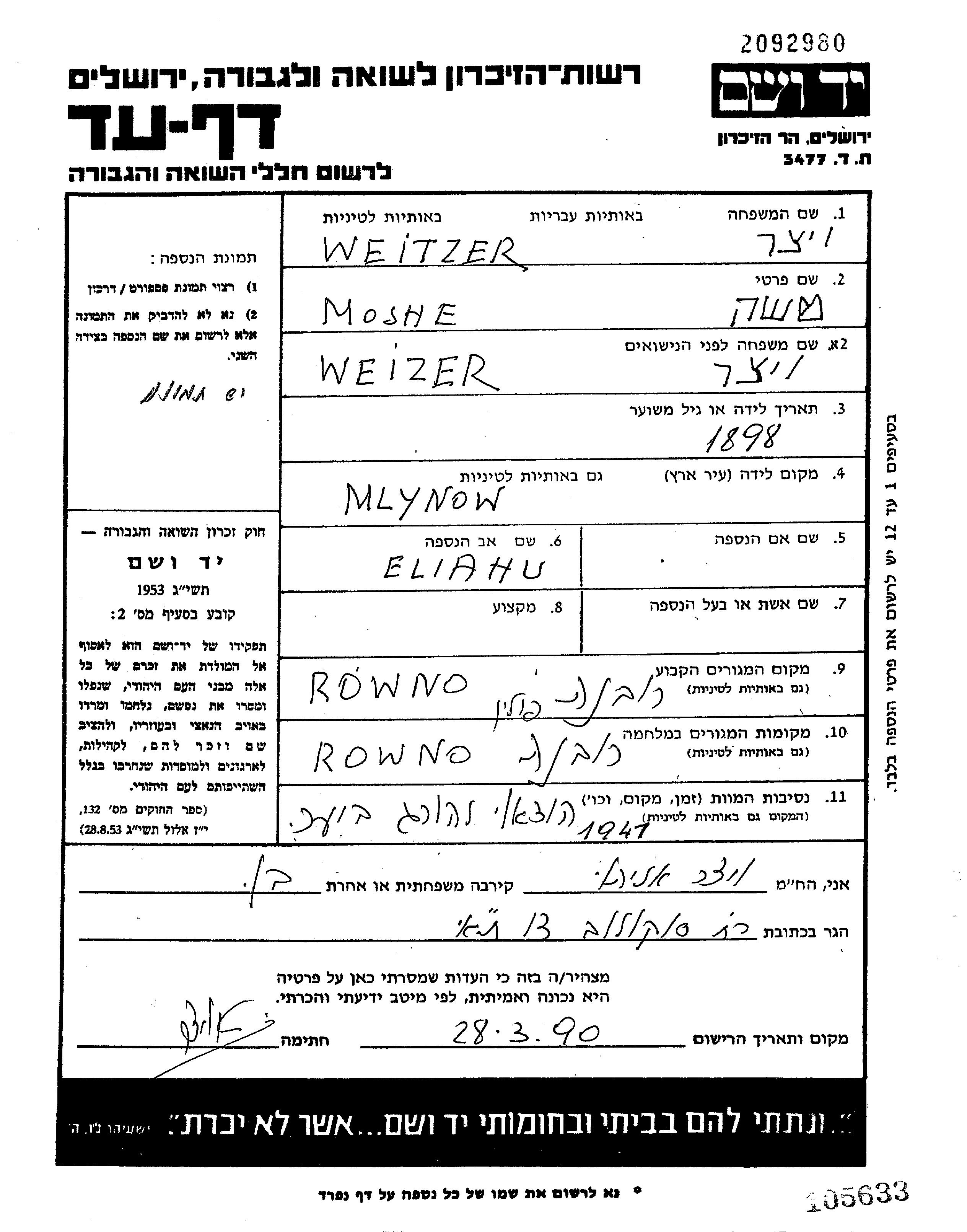 Моше Вайцер Вайзер, место рождения: Млынов, Польша. Место жительства до войны: Ровно, Польша.