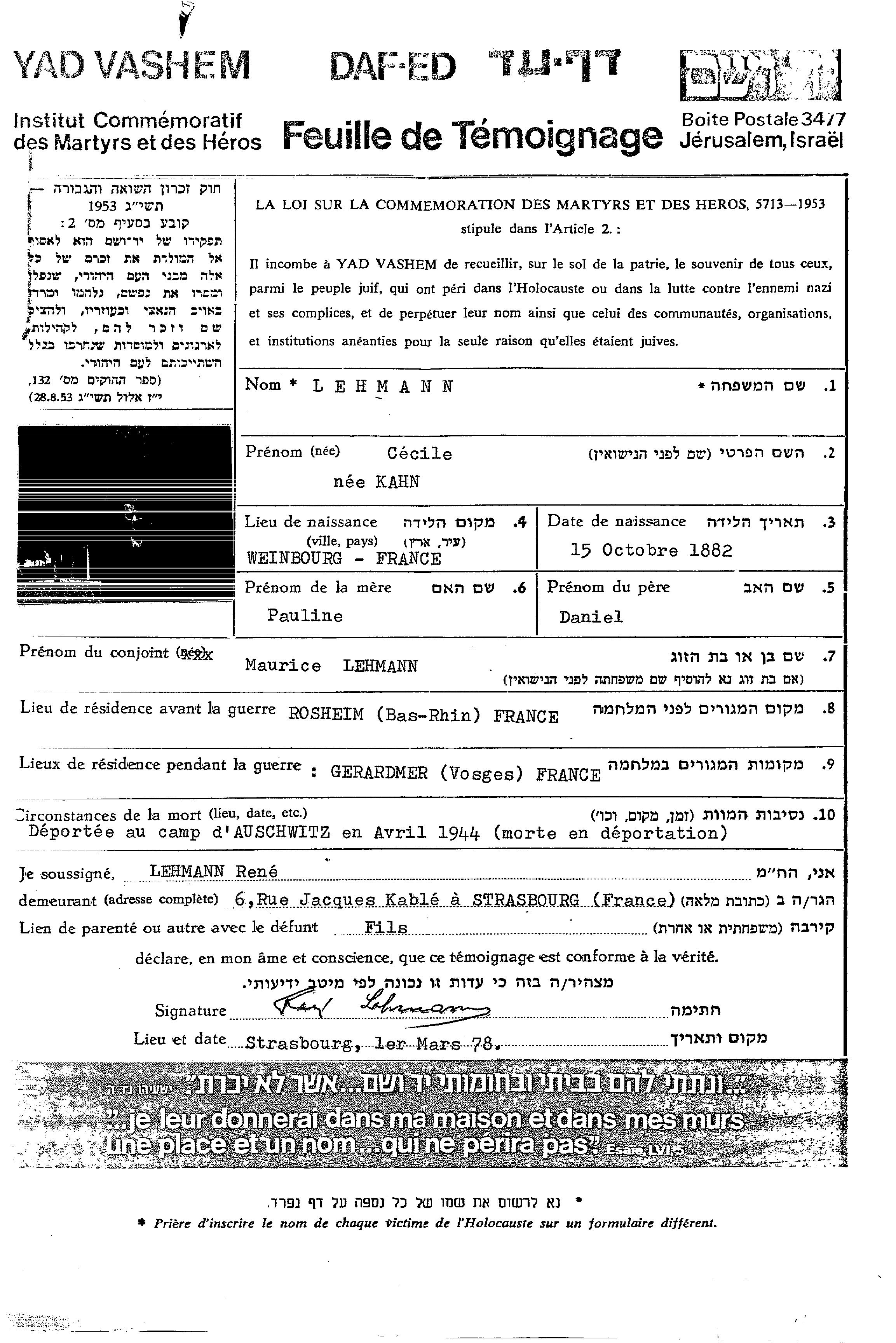 Леманн Сесиль 1882 Росхейм, Франция Лист свидетельских показаний