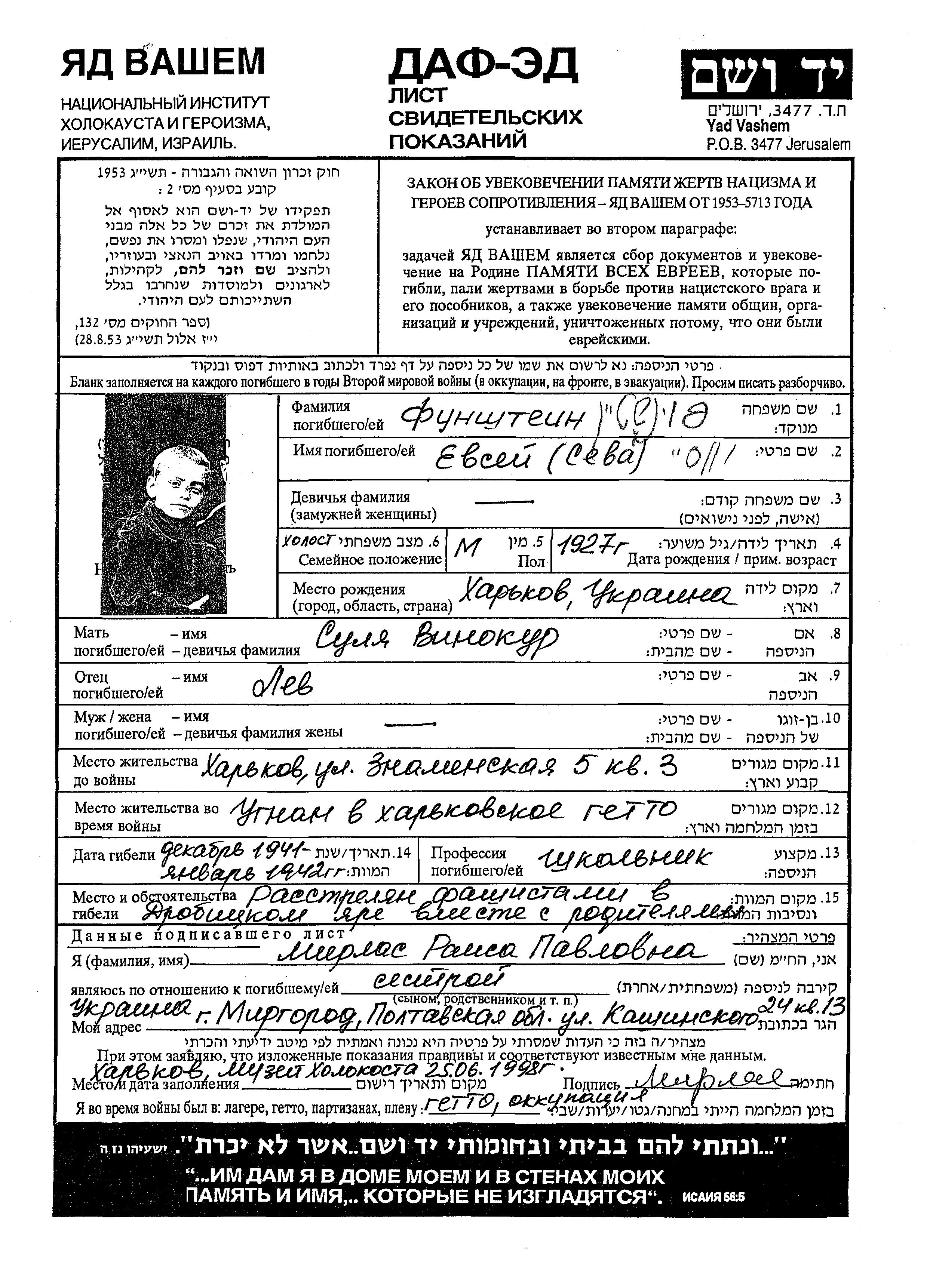 Евсей Сева Фунштейн Винокур, место рождения: Харьков, Украина (СССР). Ученик / ученица. Место жительства до войны: Харьков, Украина (СССР).