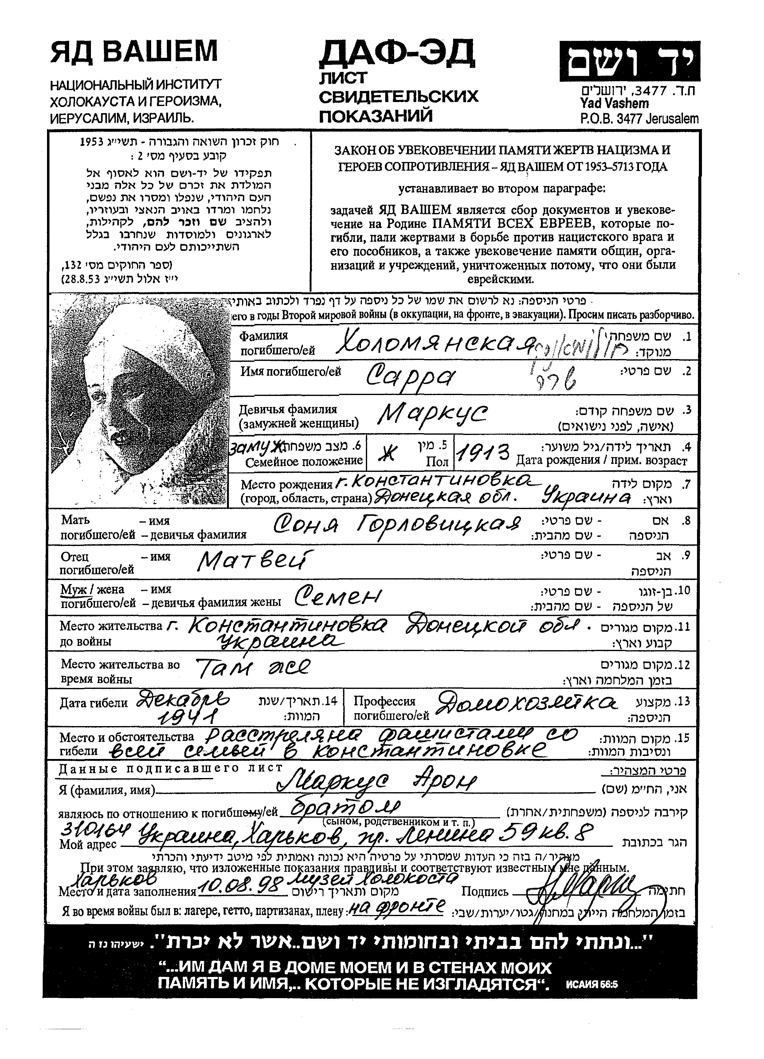 Сарра Холомянская, девичья фамилия Маркус, место рождения: Константиновка, Украина (СССР). Домохозяйка. Место жительства до войны: Константиновка, Украина (СССР).