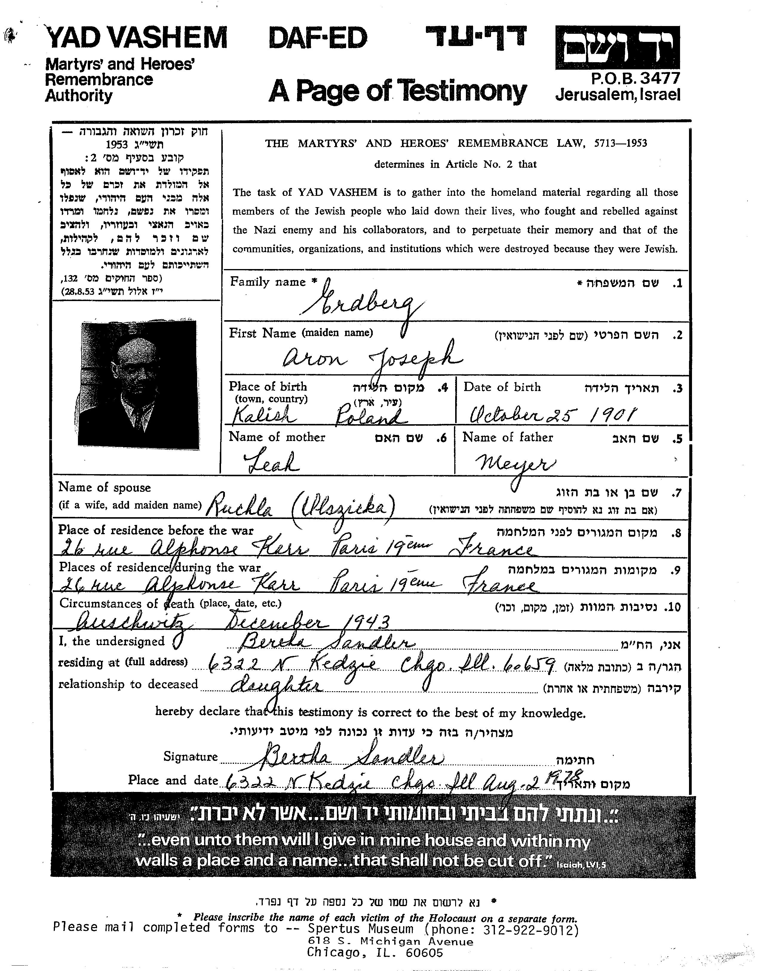 Эрдберг | Арон Йосеф | 1901 | Париж, Франция | Лист свидетельских показаний |