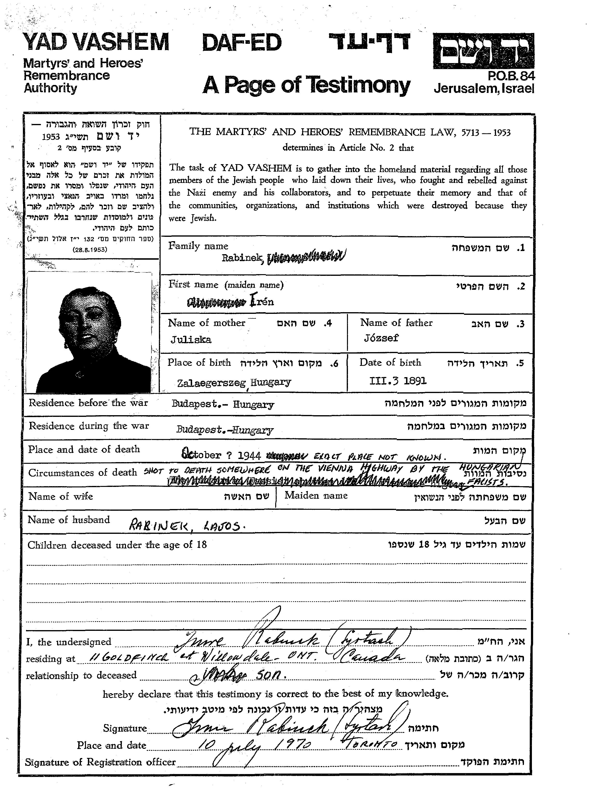 Ирен Рабинек, место рождения: Залаэгерсег, Венгрия. Место жительства до войны: Будапешт, Венгрия.