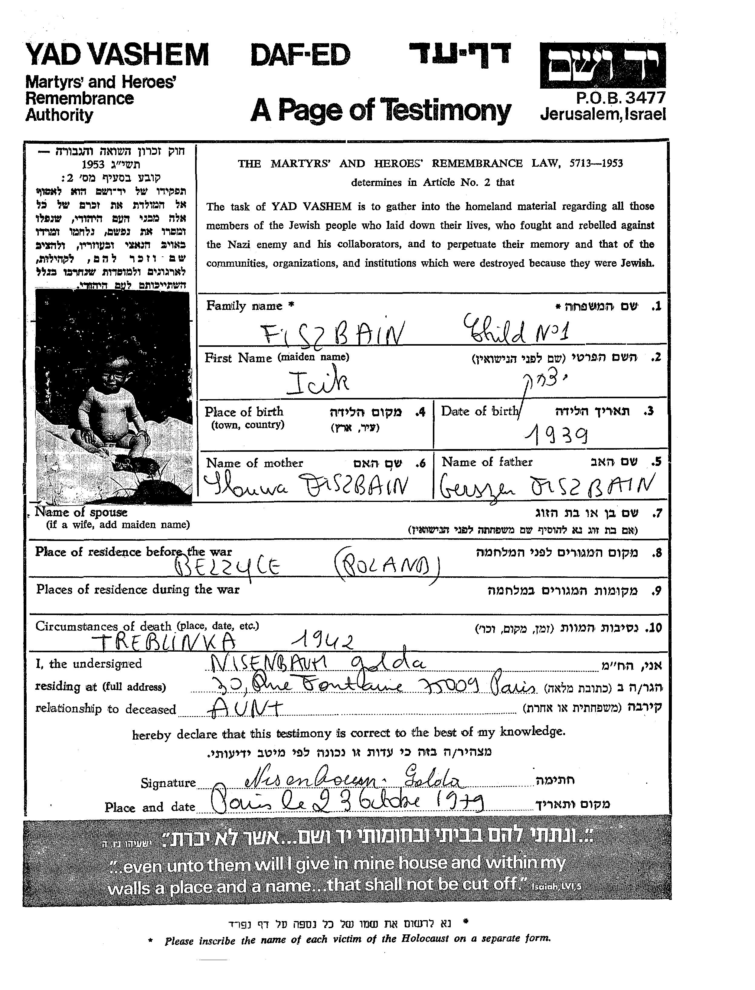 Фишбайн Ицик 1939 Белжице, Польша Лист свидетельских показаний