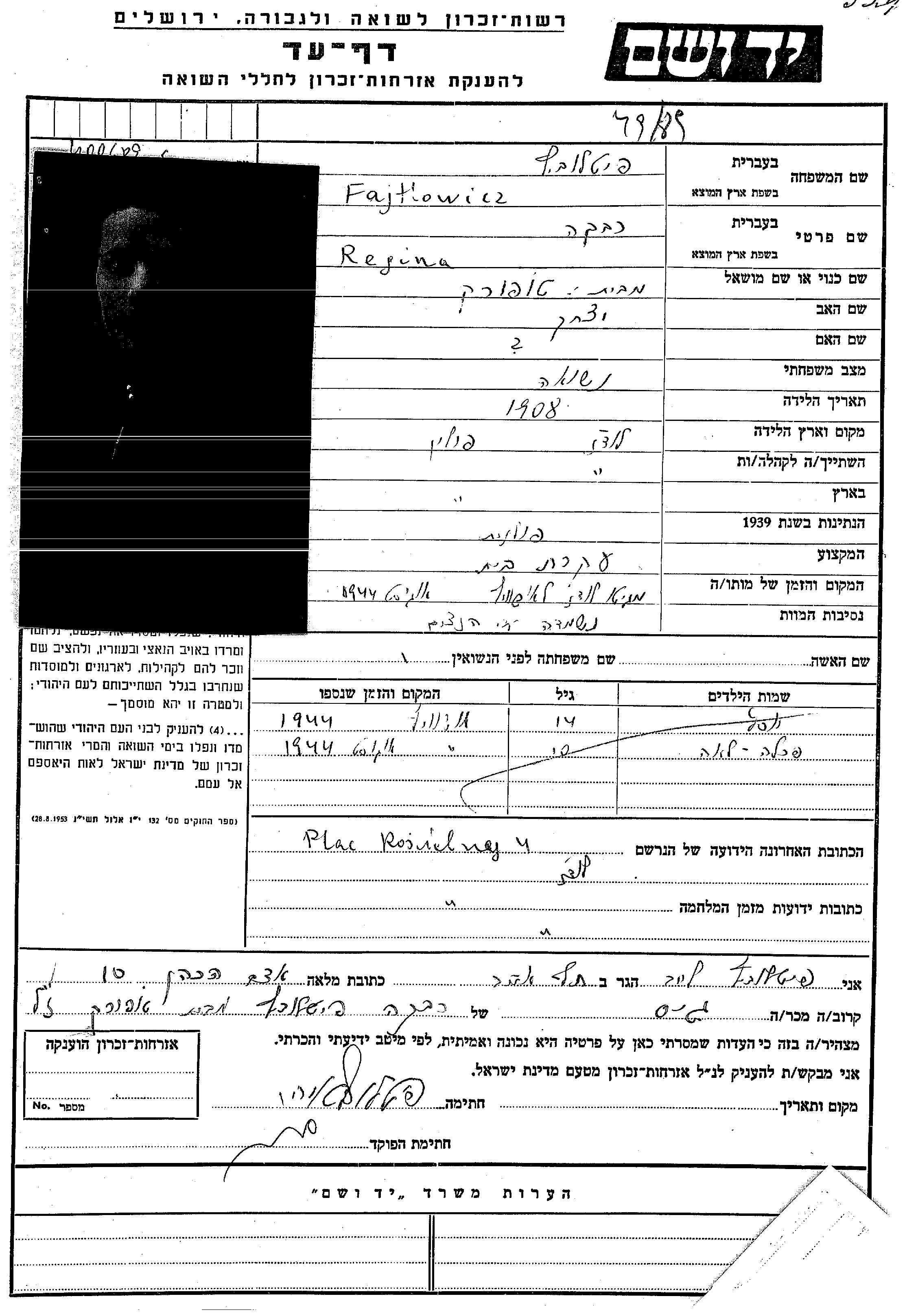 Файтлович Регина Ривка 1908 Лодзь, Польша Лист свидетельских показаний