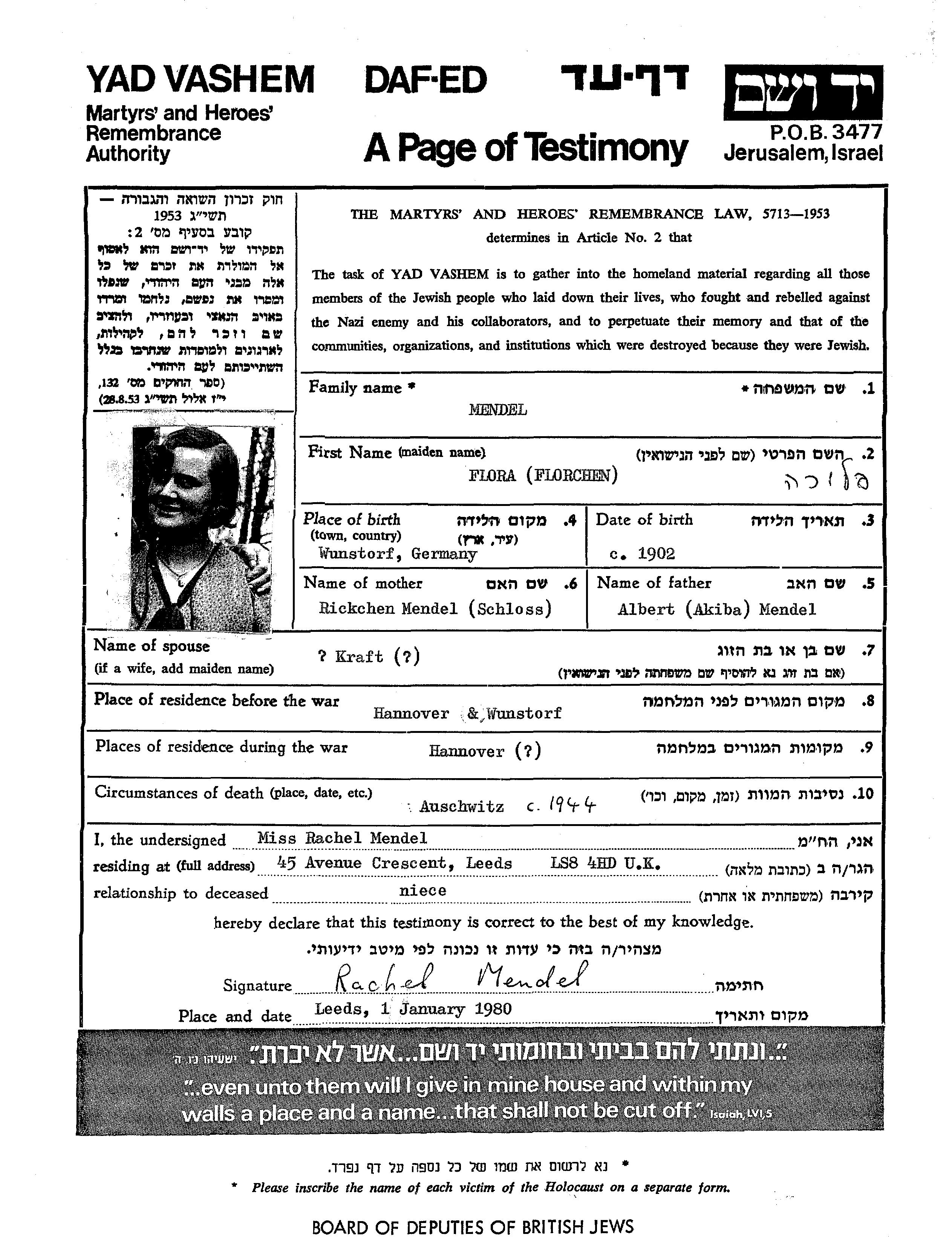 Флора Крафт, девичья фамилия Мендель, место рождения: Ганновер, Германия. Место жительства до войны: Ганновер, Германия.