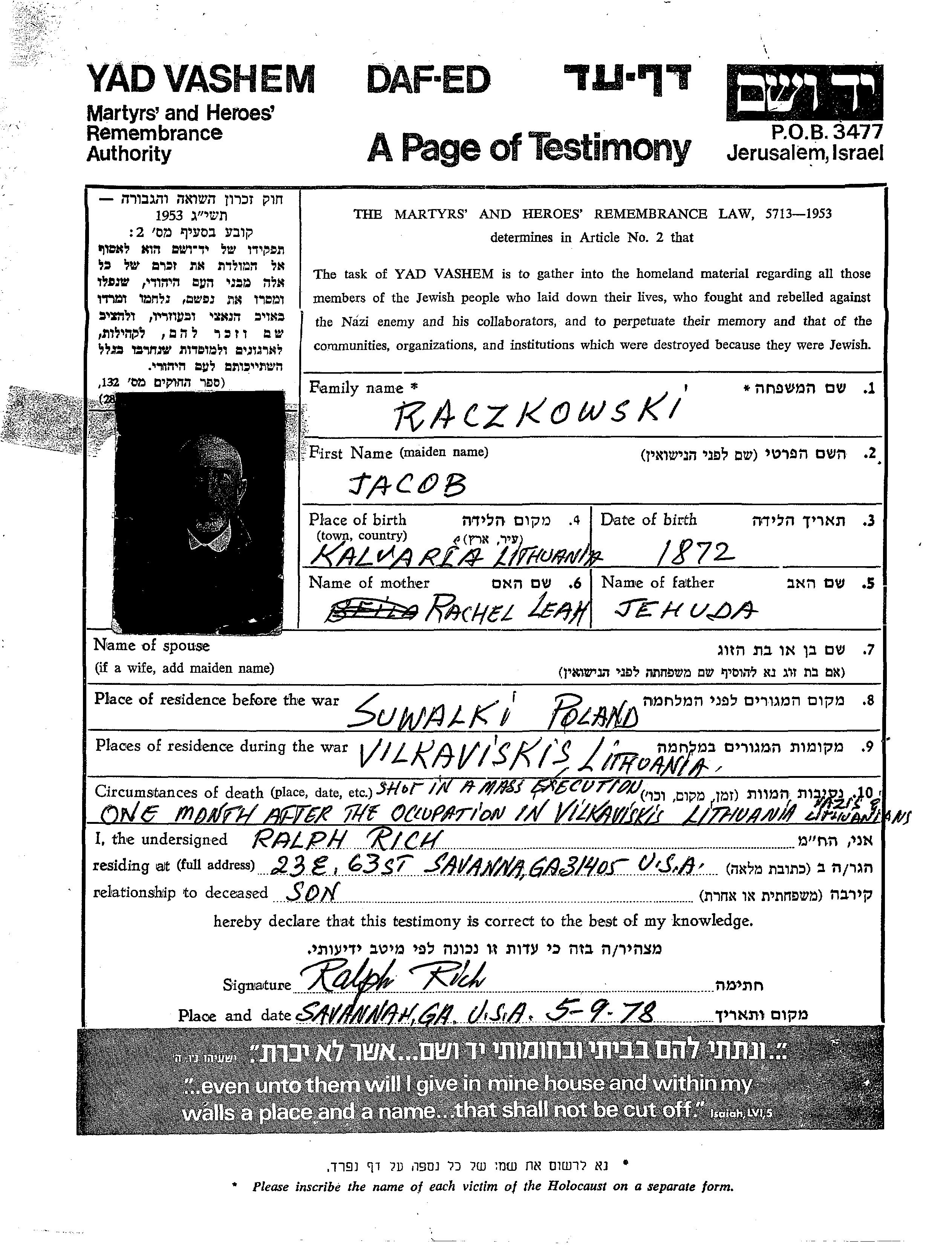 Якоб Рачковски, место рождения: Калвария, Литва. Место жительства до войны: Сувалки, Польша.