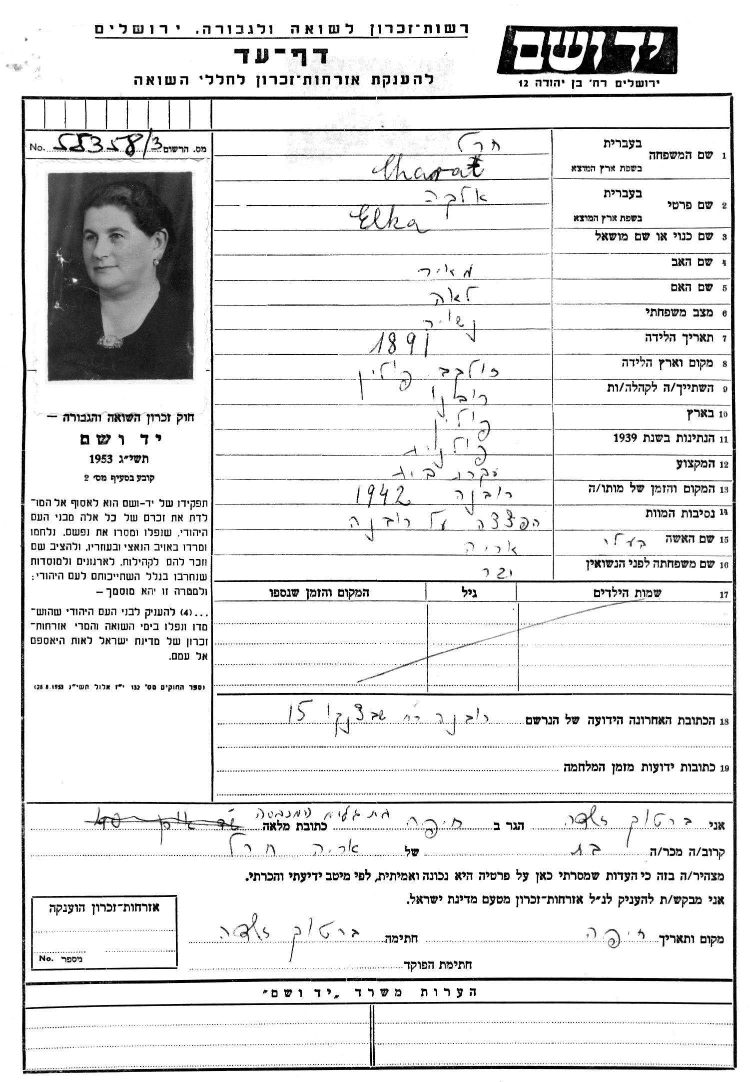 Элка Хана Charał, девичья фамилия Егер, место рождения: Жолкев, Польша. Домохозяйка. Место жительства до войны: Ровно, Польша.