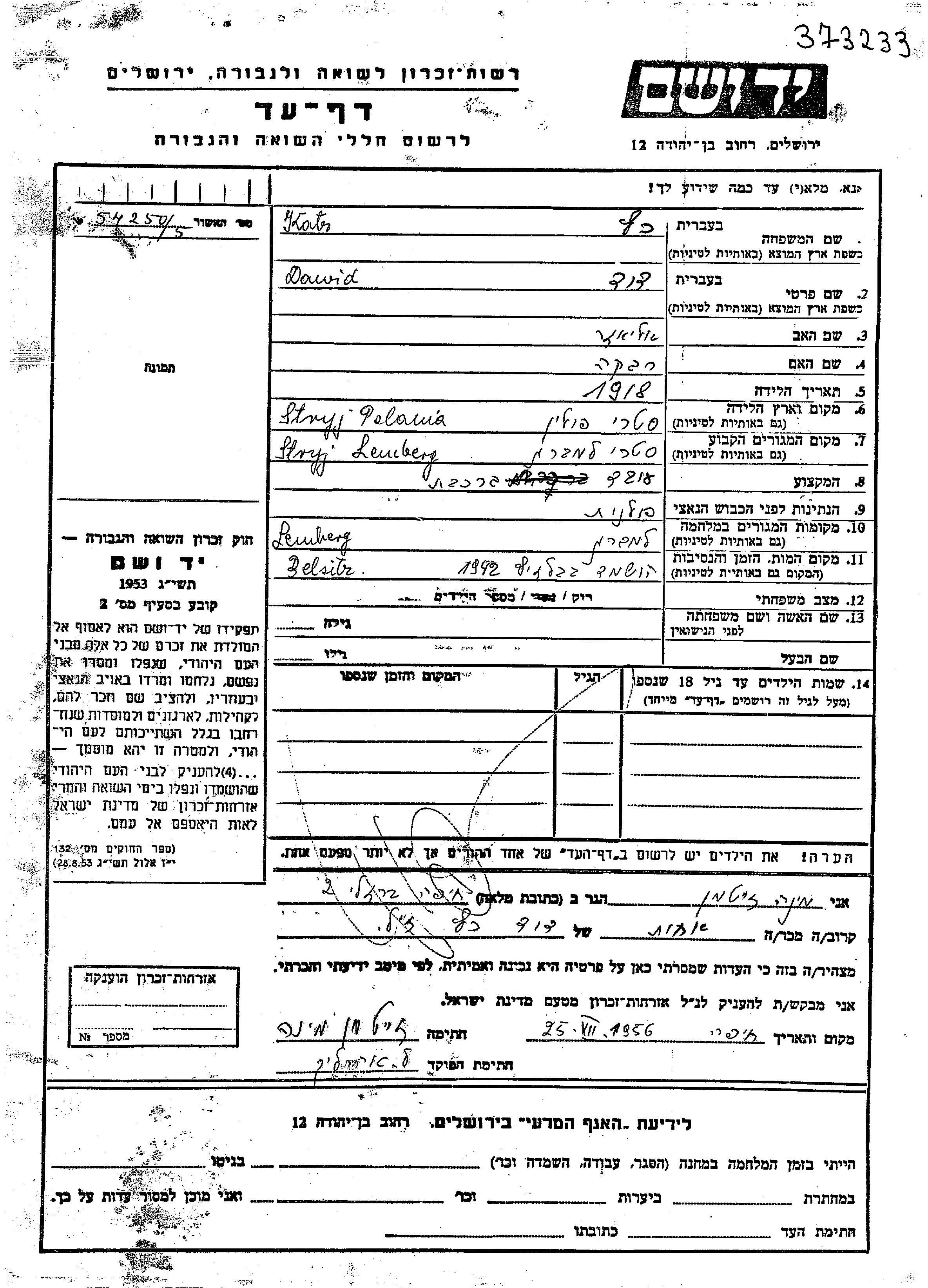Кац Давид 1918 Лемберг, Польша Лист свидетельских показаний