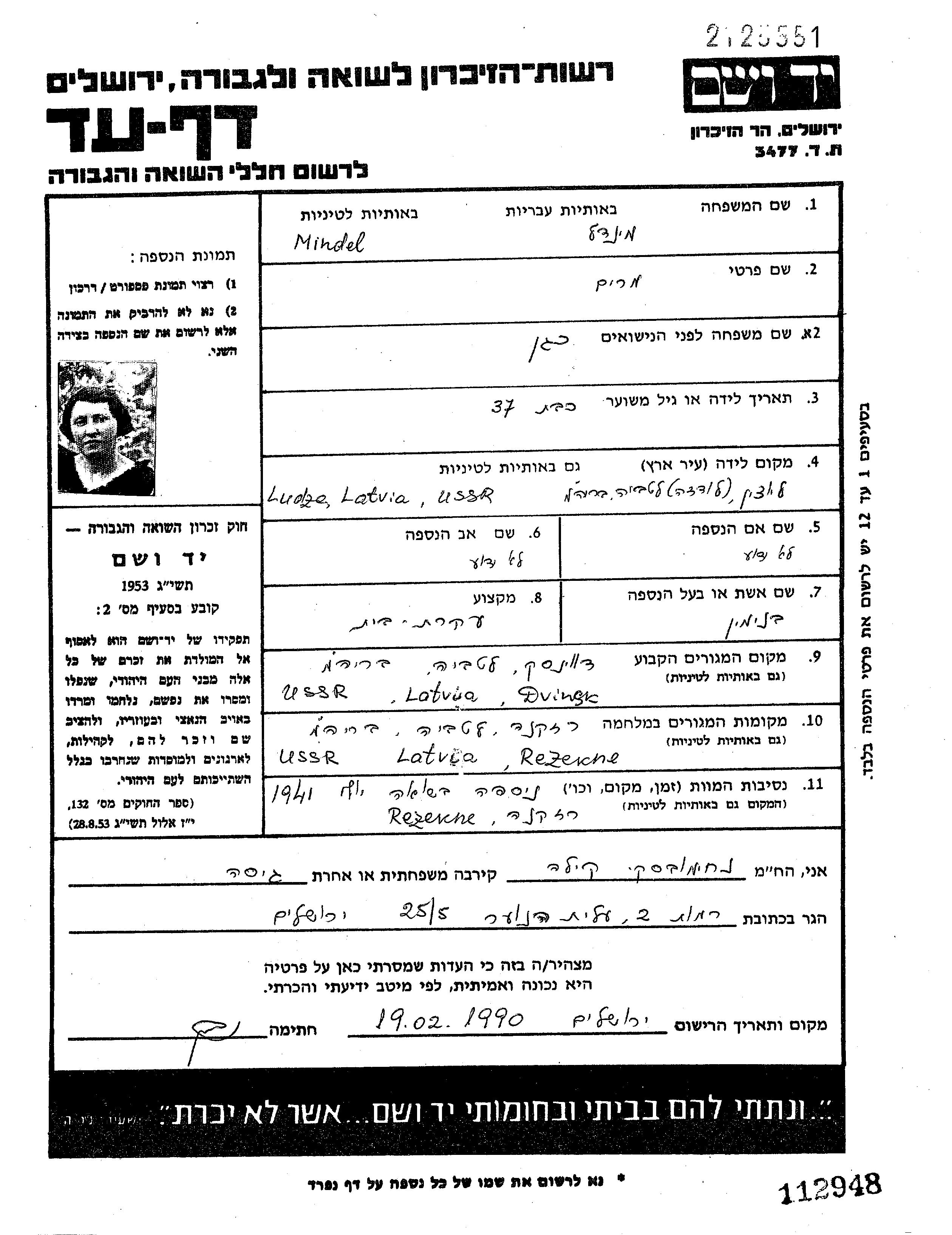 Миндель Мирьям Двинск, Латвия Лист свидетельских показаний