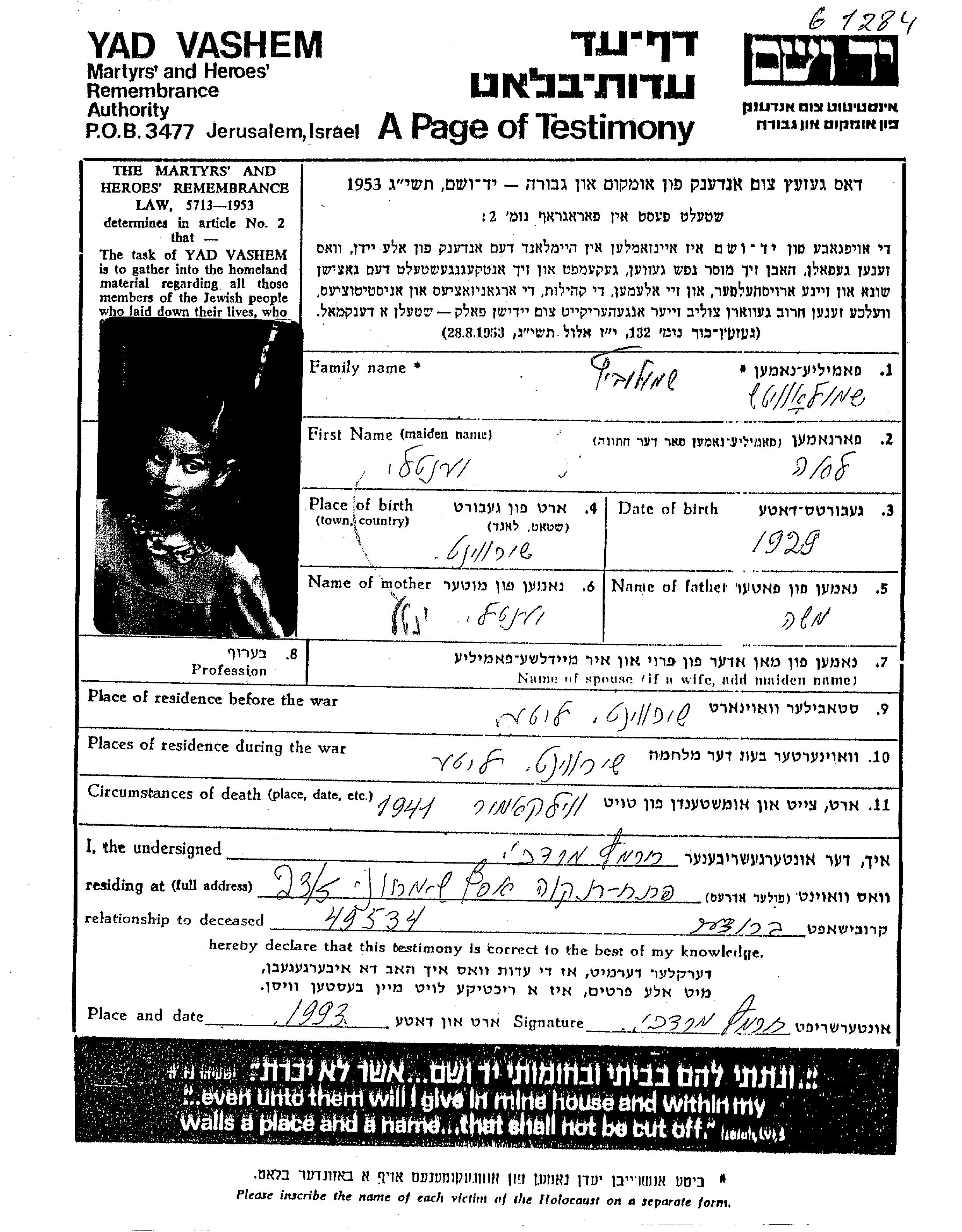 Яд Вашем - Листы свидетельских показаний Мемориального фонда