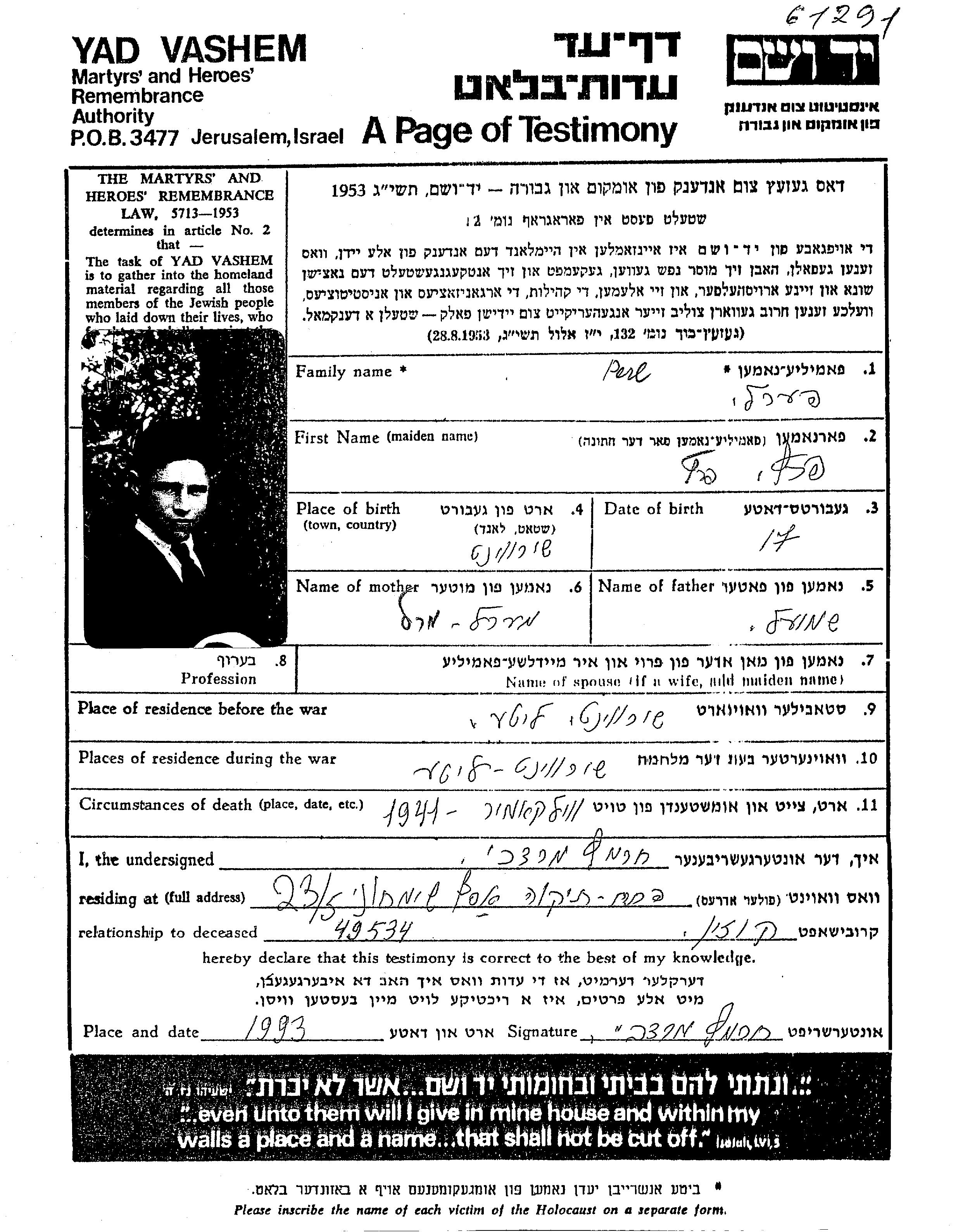 Перец Перль, место рождения: Ширвинтос, Литва. Место жительства до войны: Ширвинтос, Литва.