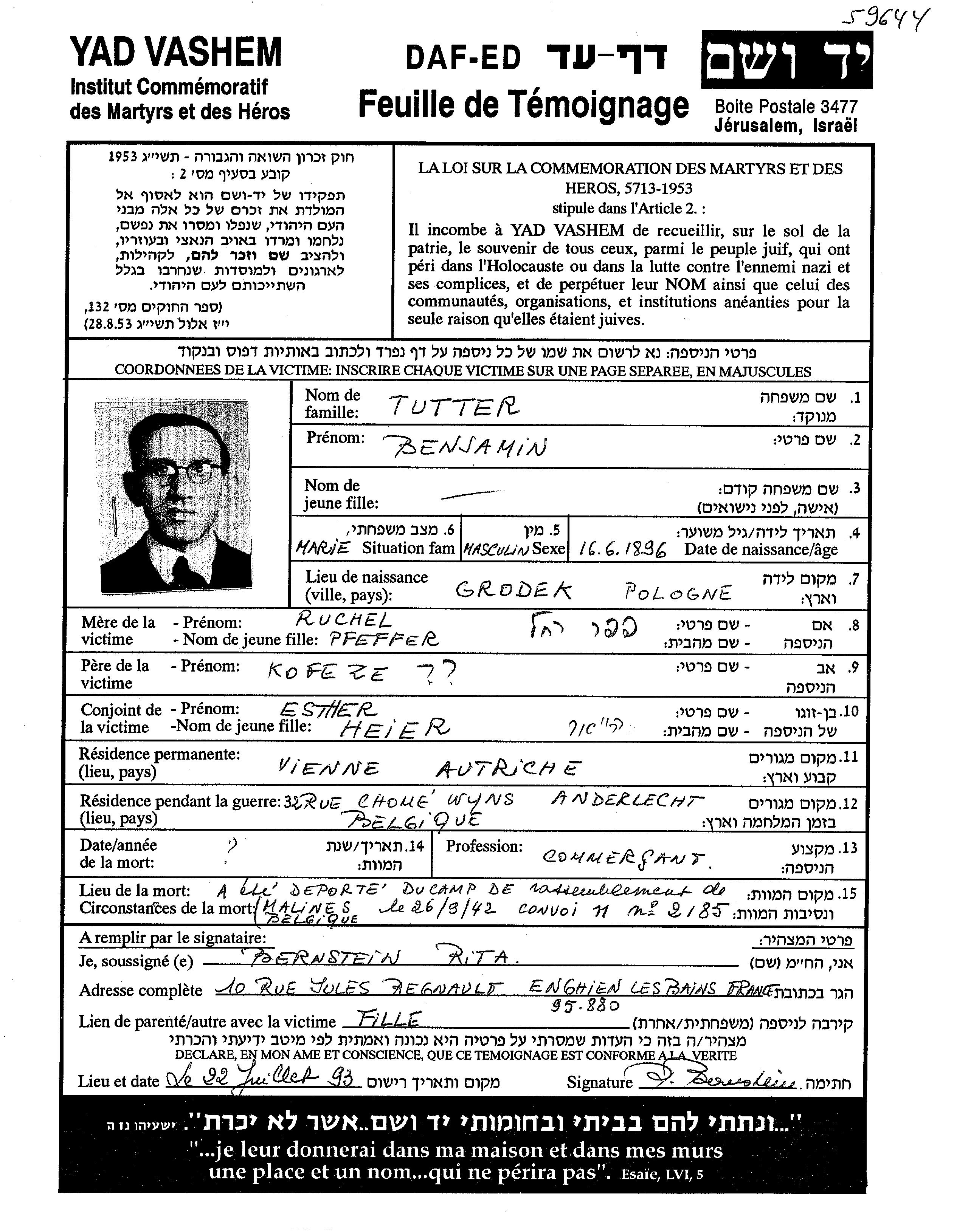 Туттер | Беньямин | 1896 | Вена, Австрия | Лист свидетельских показаний |