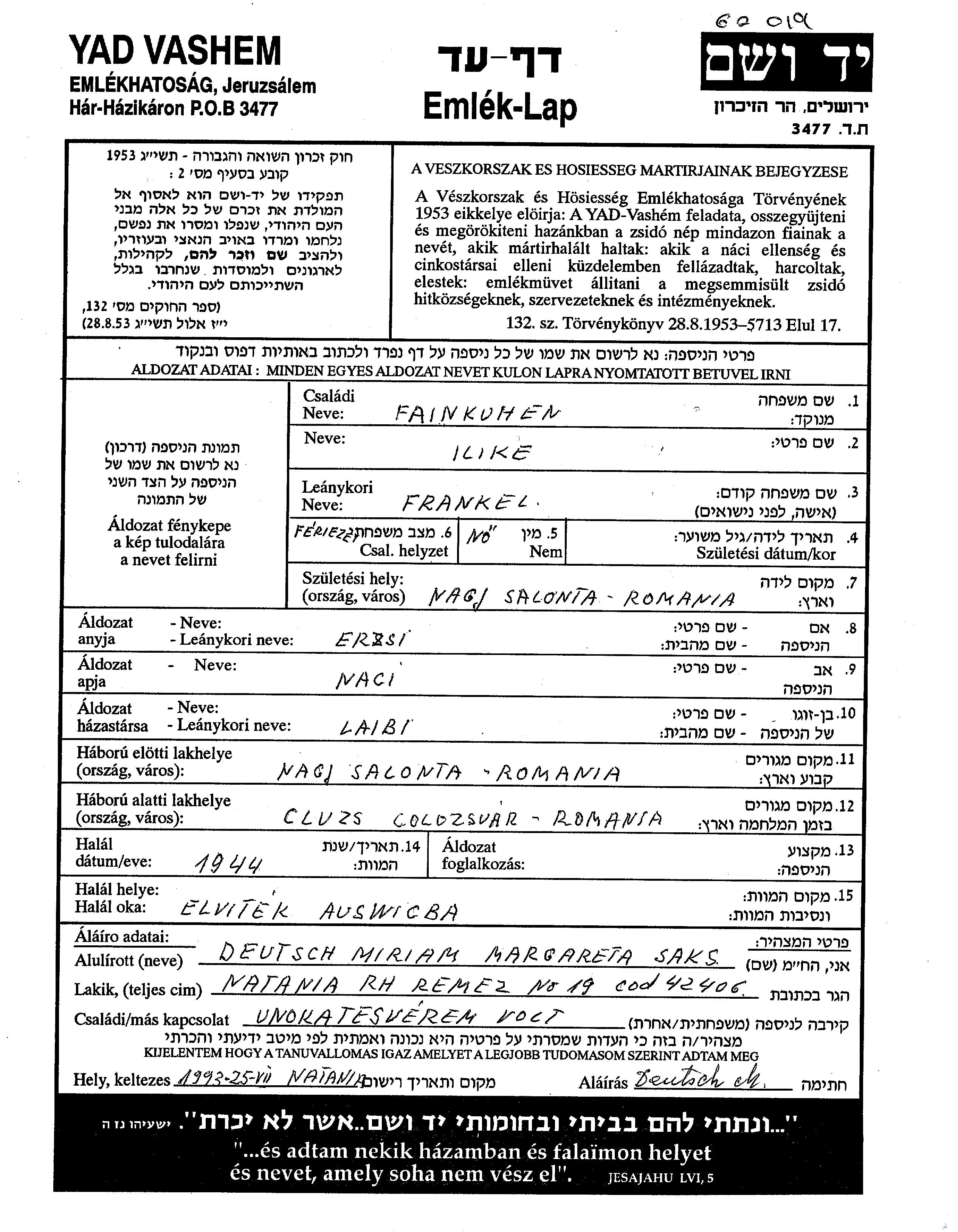 Илике Файнкухен, девичья фамилия Френкель, место рождения: Салонта, Румыния. Место жительства до войны: Салонта, Румыния.