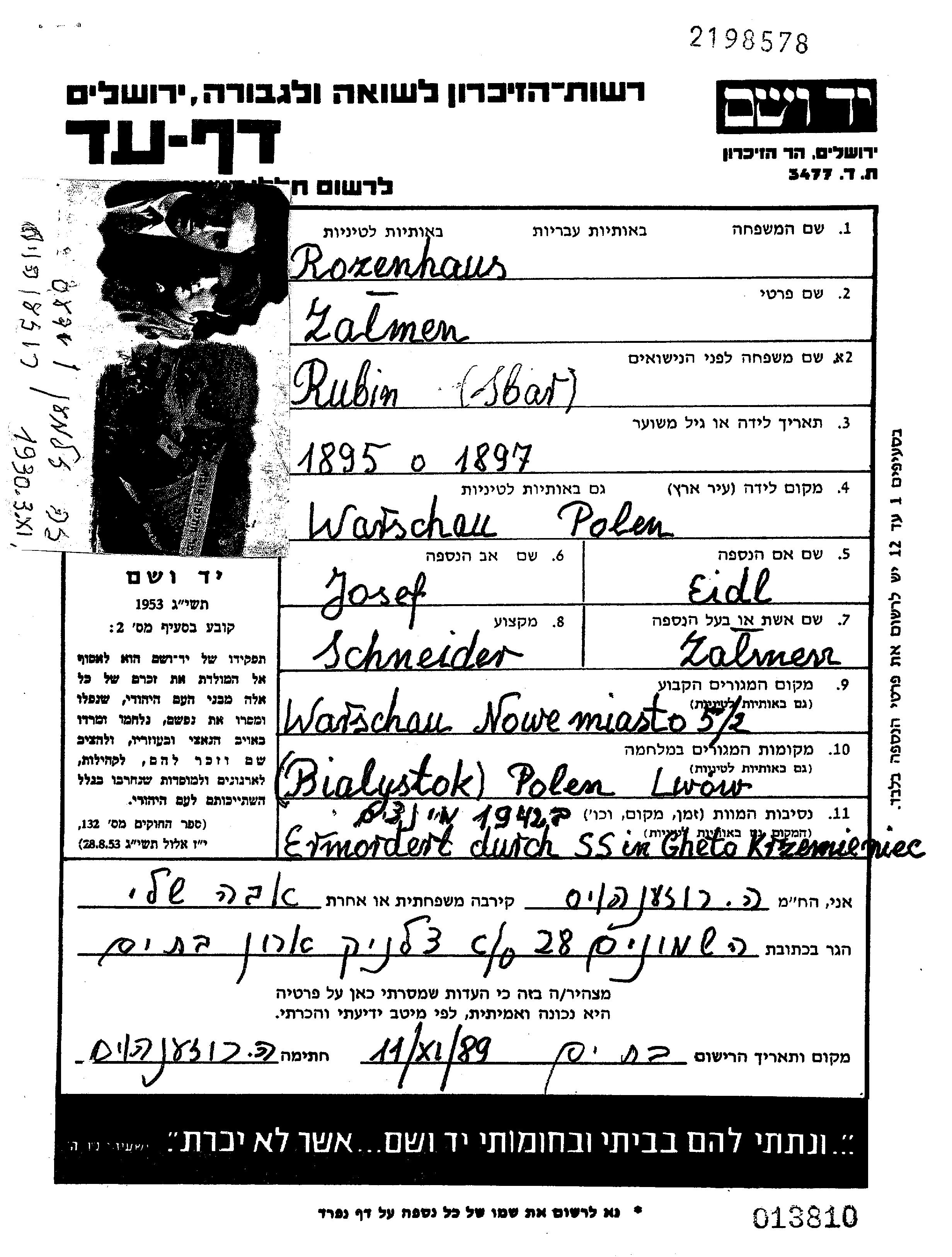 Розенхаус Залмен 1895 Варшава, Польша Лист свидетельских показаний