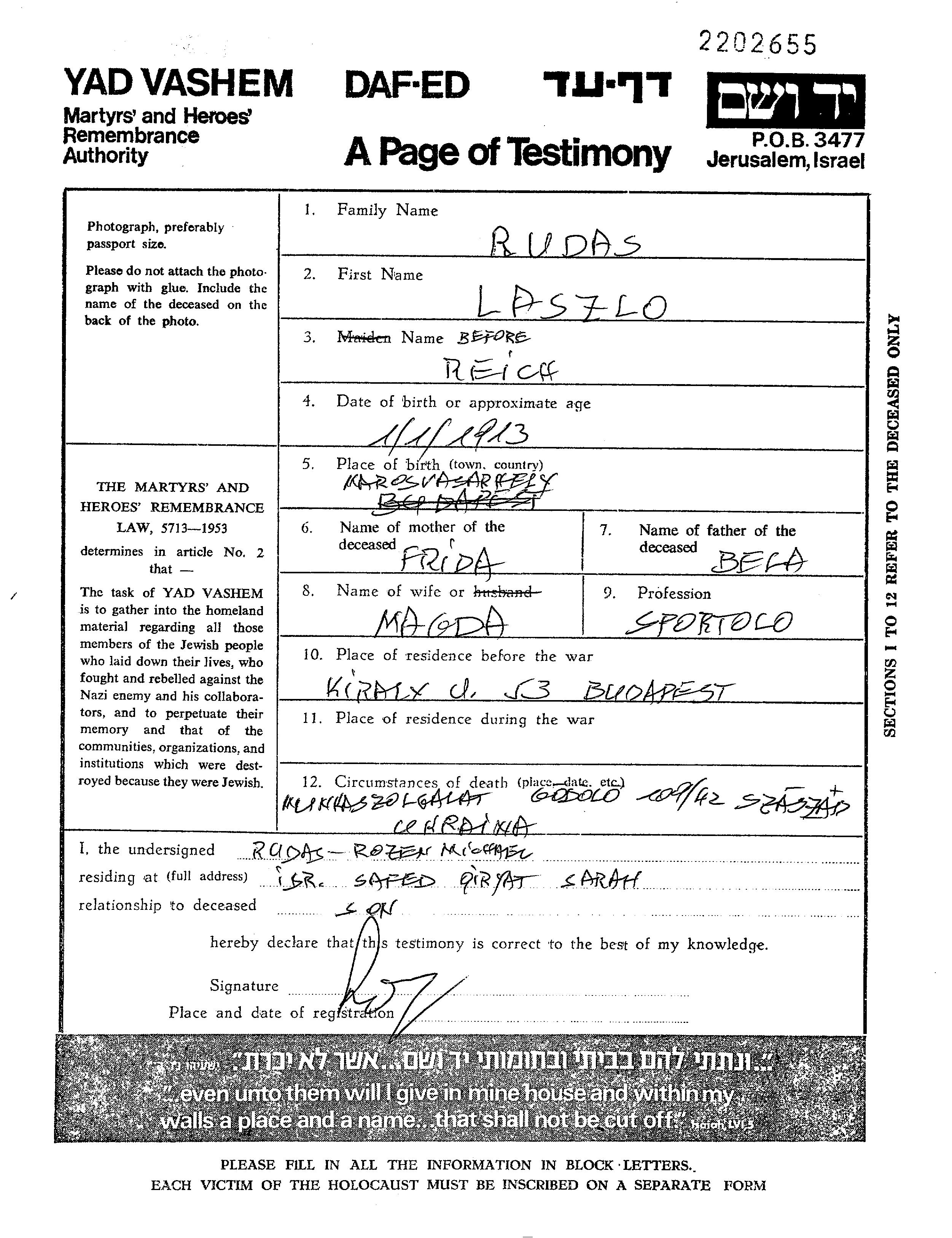 Ласло Рейх Рудаш, место рождения: Тыргу-Муреш, Румыния. Спортсмен. Место жительства до войны: Будапешт, Венгрия.