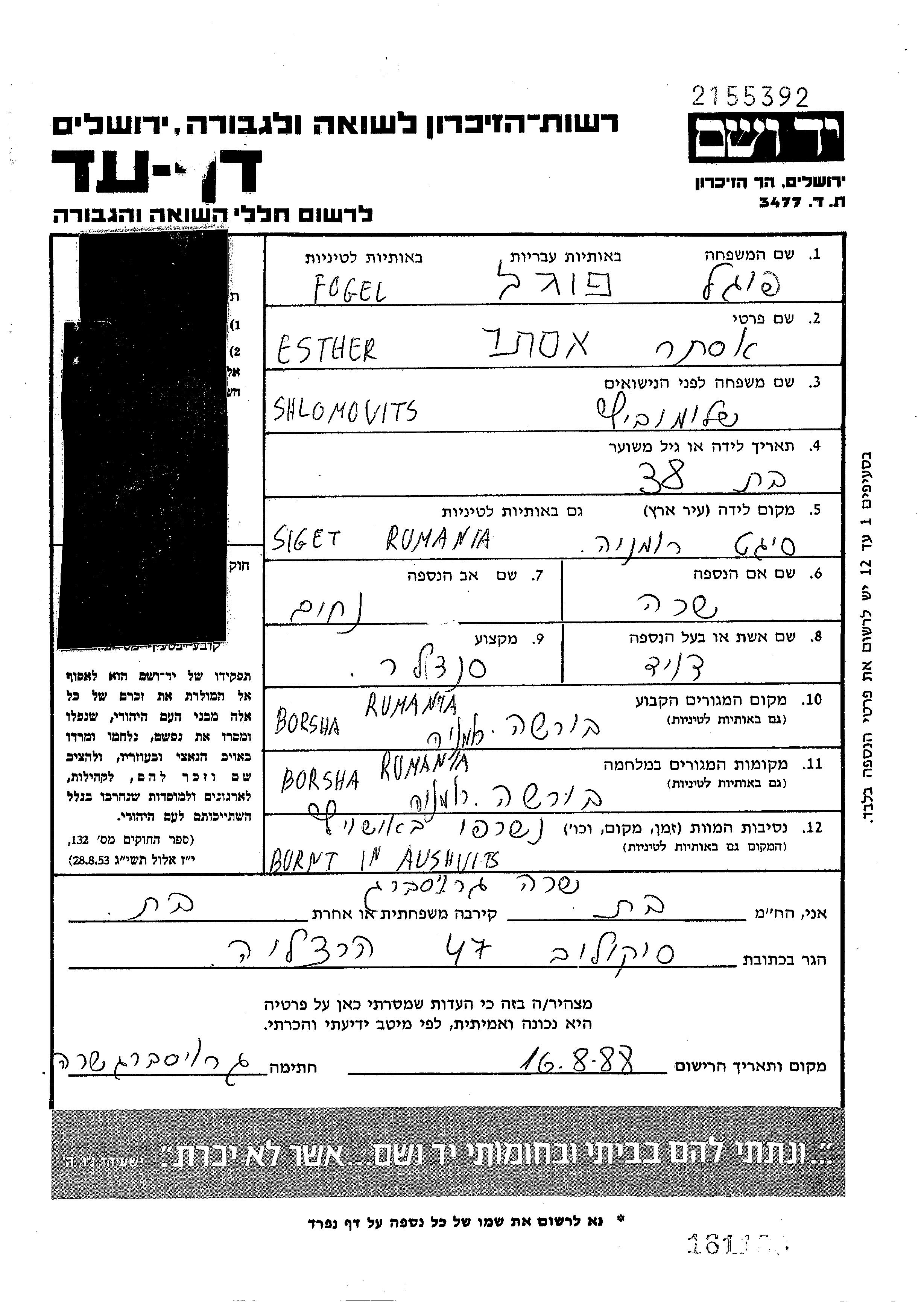 Эстер Фогель, девичья фамилия Шломовиц, место рождения: Сигет, Румыния. Домохозяйка. Место жительства до войны: Борша, Румыния.