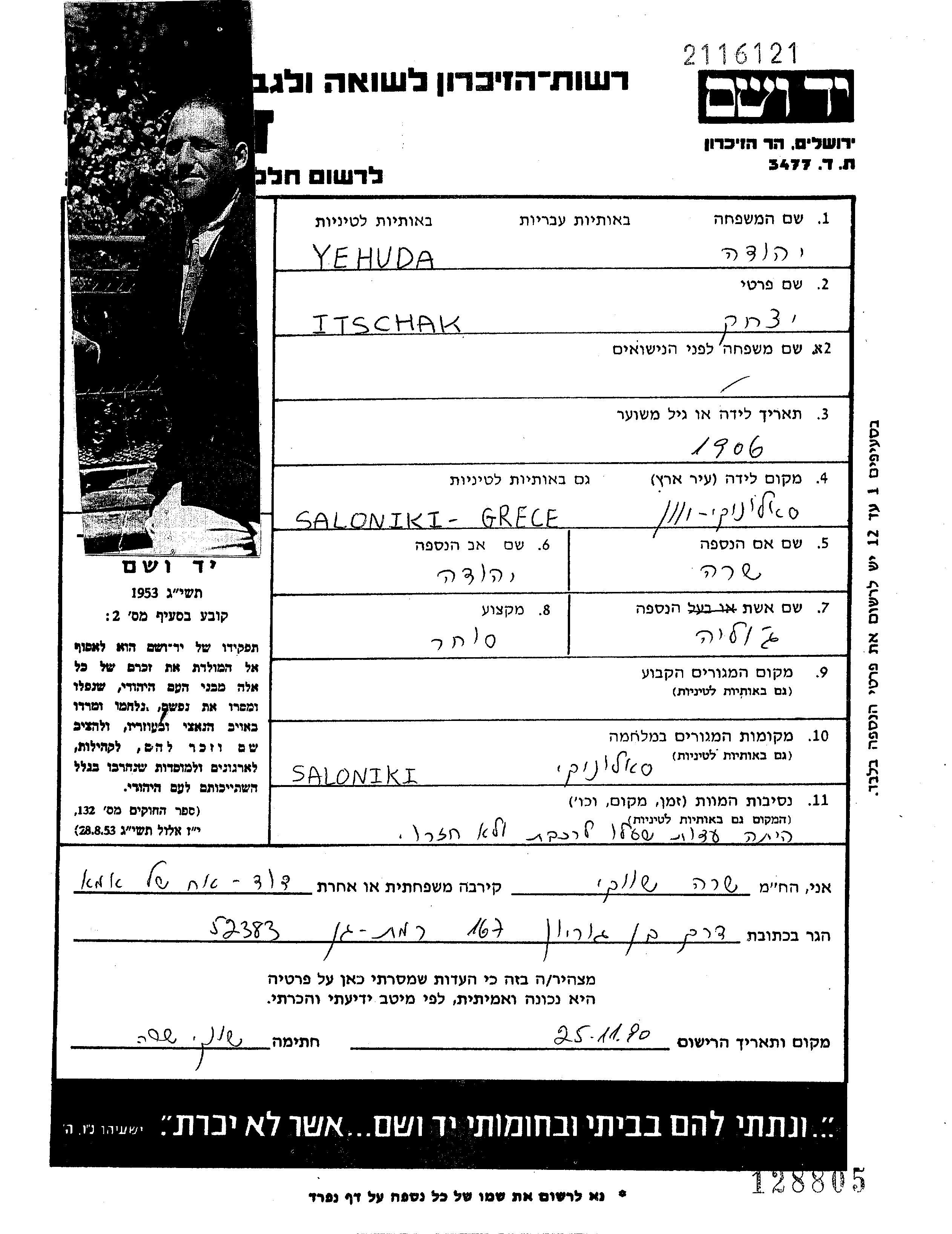 Иегуда Ицхак 1906 Салоники, Греция Лист свидетельских показаний