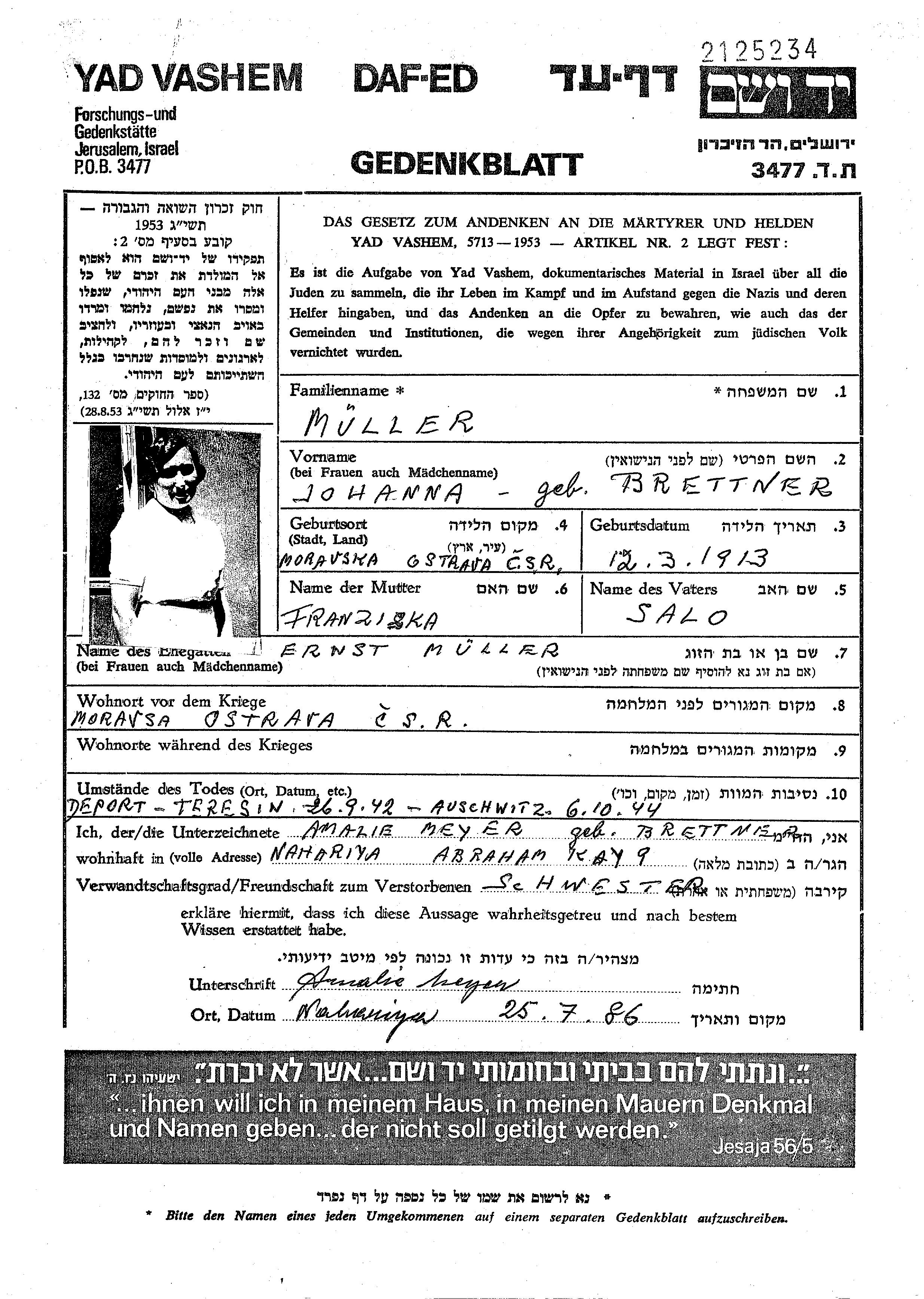 Йоханна Мюллер, девичья фамилия Бреттнер, место рождения: Моравска Острава, Чехословакия. Место жительства до войны: Моравска Острава, Чехословакия.