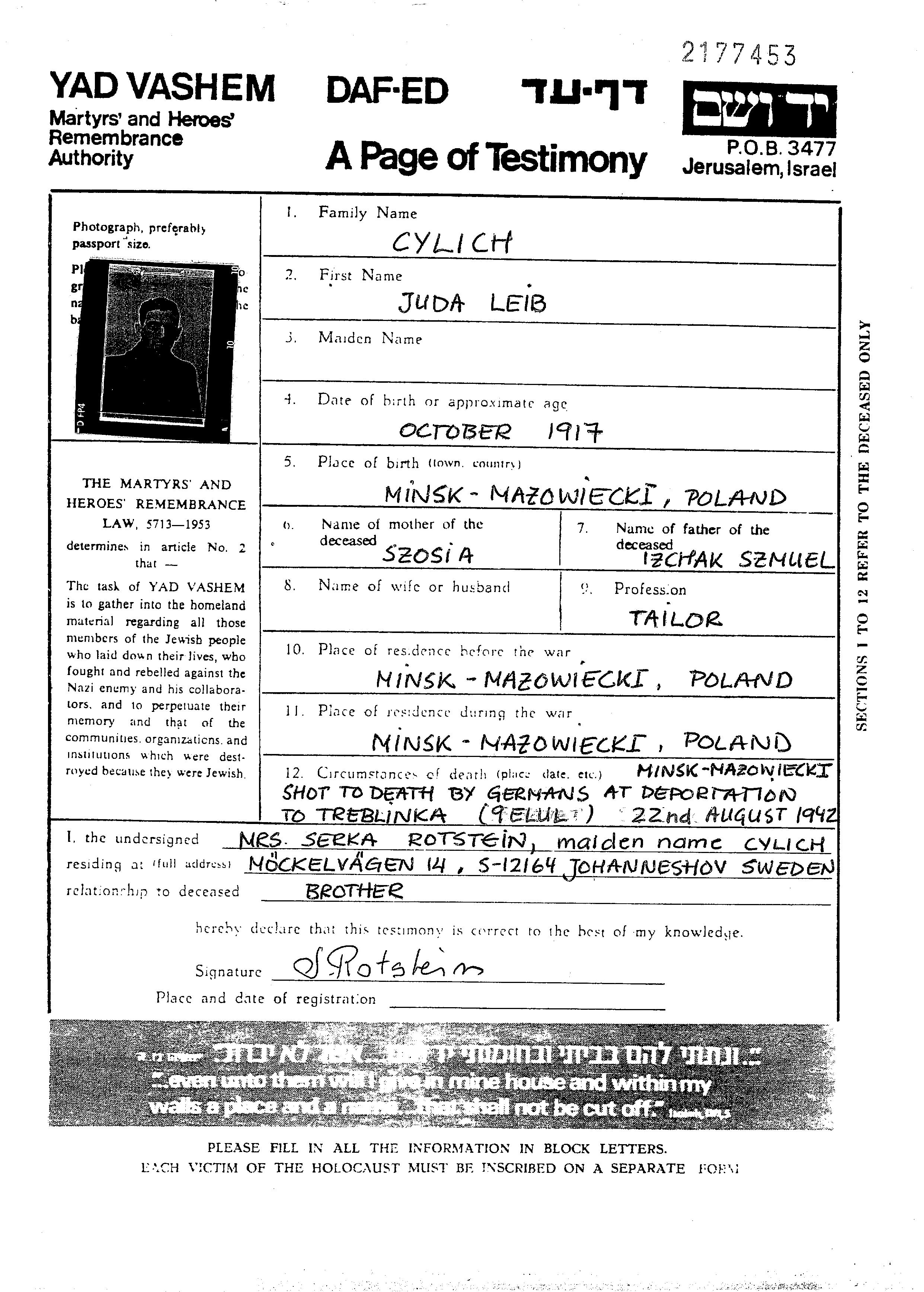 Цылих Юда Лейб 1917 Миньск-Мазовецки, Польша Лист свидетельских показаний