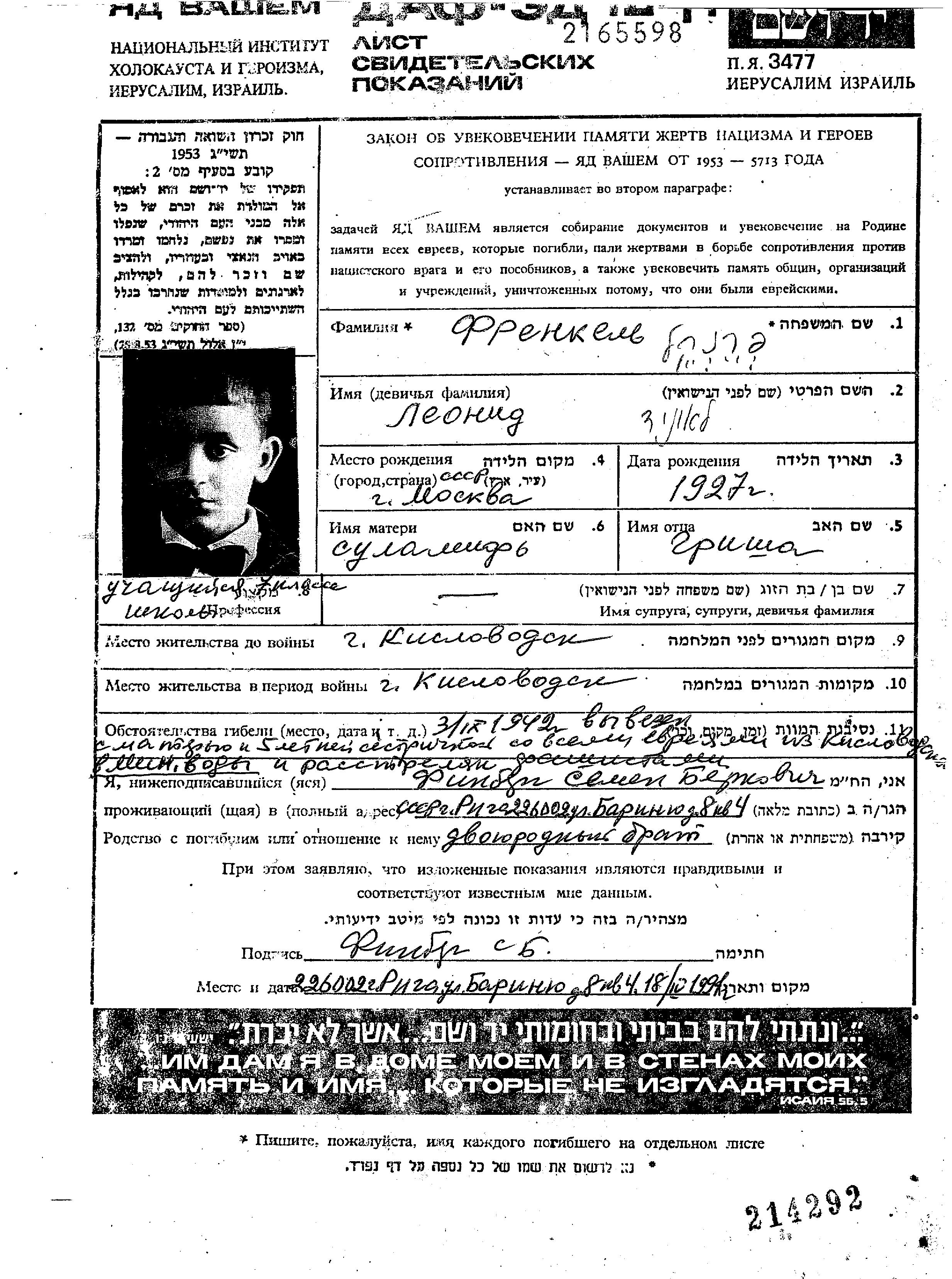 Френкель Леонид 1927 Кисловодск, Россия (СССР) Лист свидетельских показаний