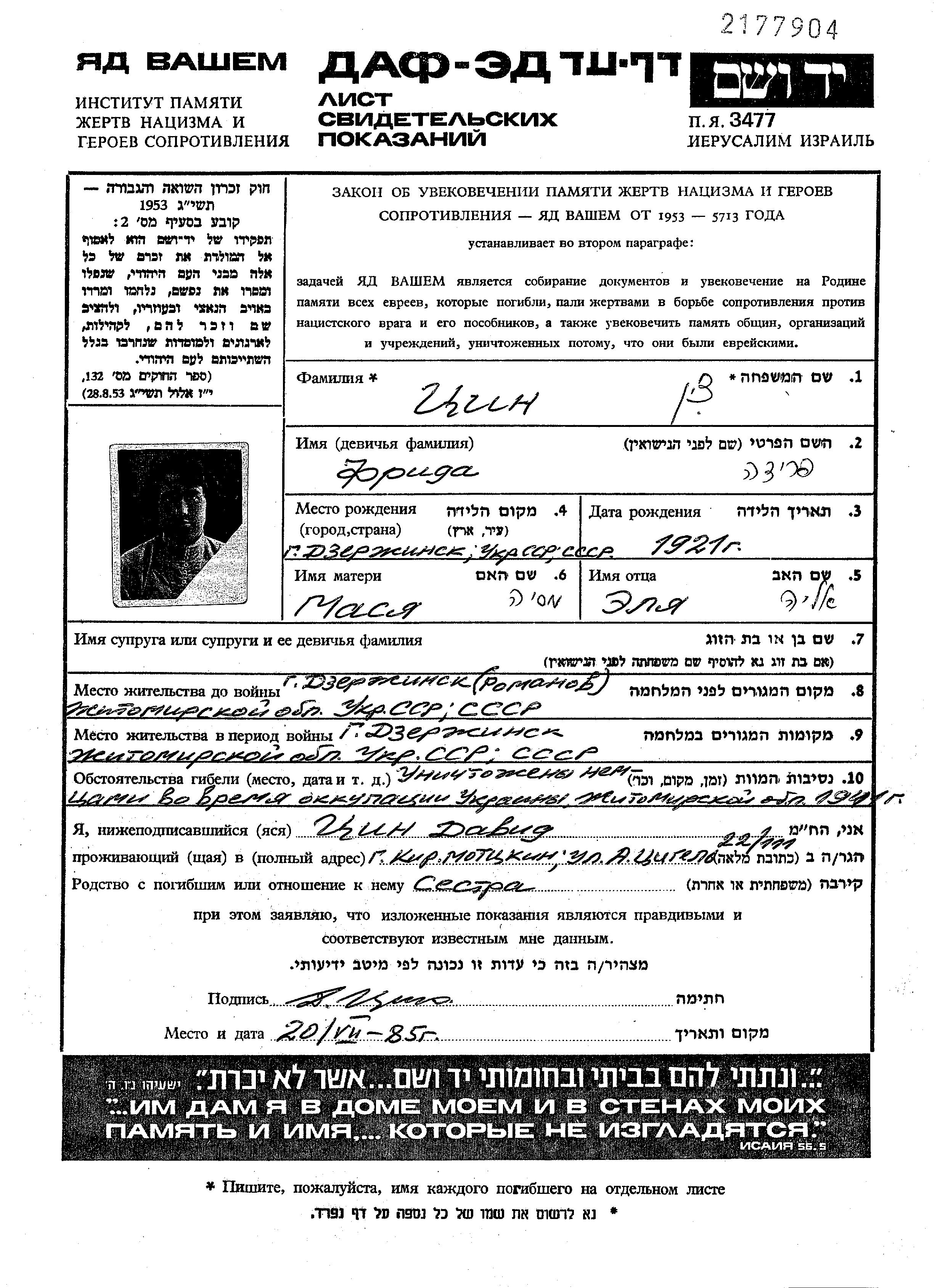 Цин Фрида 1921 Дзержинск, Украина (СССР) Лист свидетельских показаний