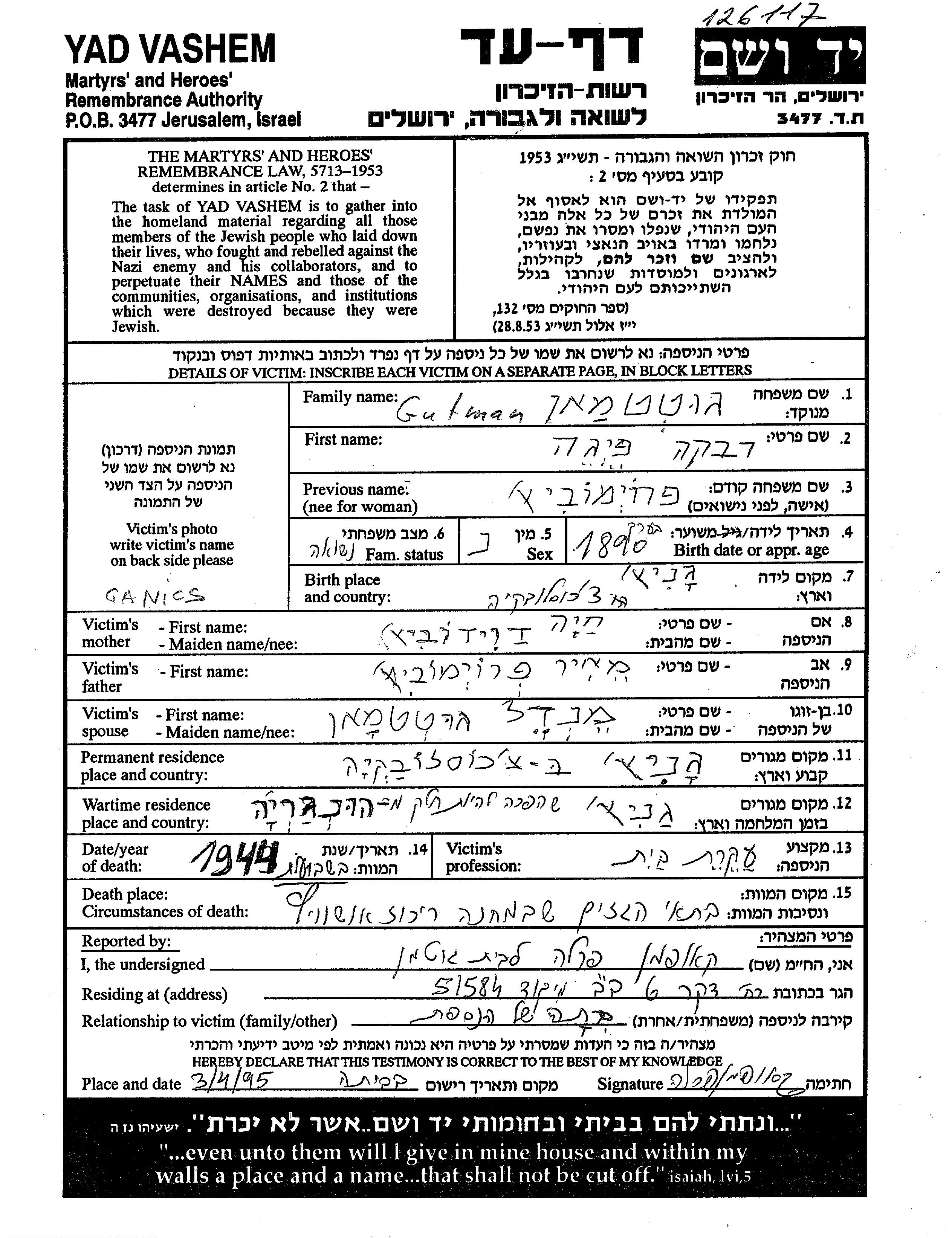 Гутман | Ривка Фейга | 1890 | Ганич, Чехословакия | Лист свидетельских показаний |