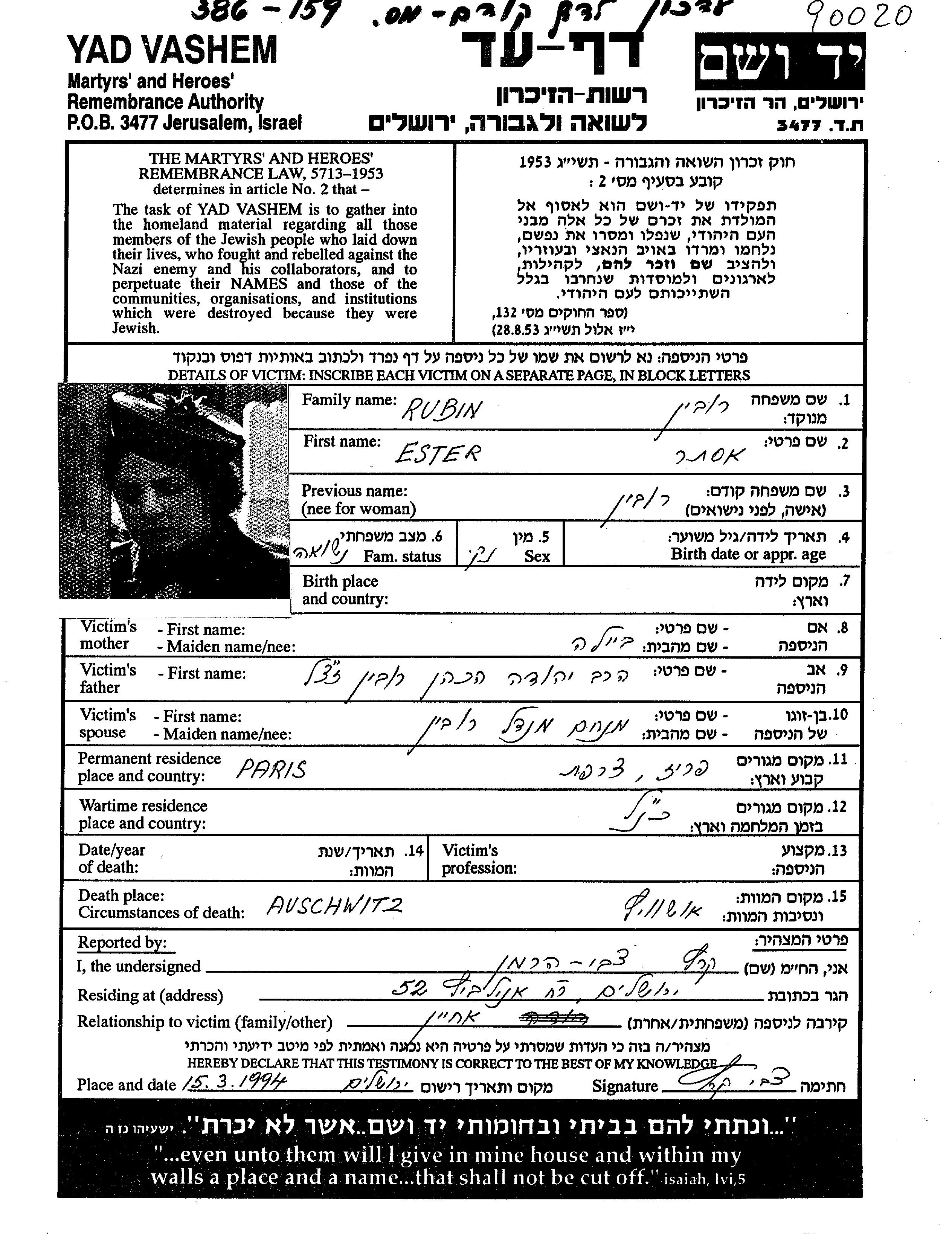 Рубин Эстер Париж, Франция Лист свидетельских показаний