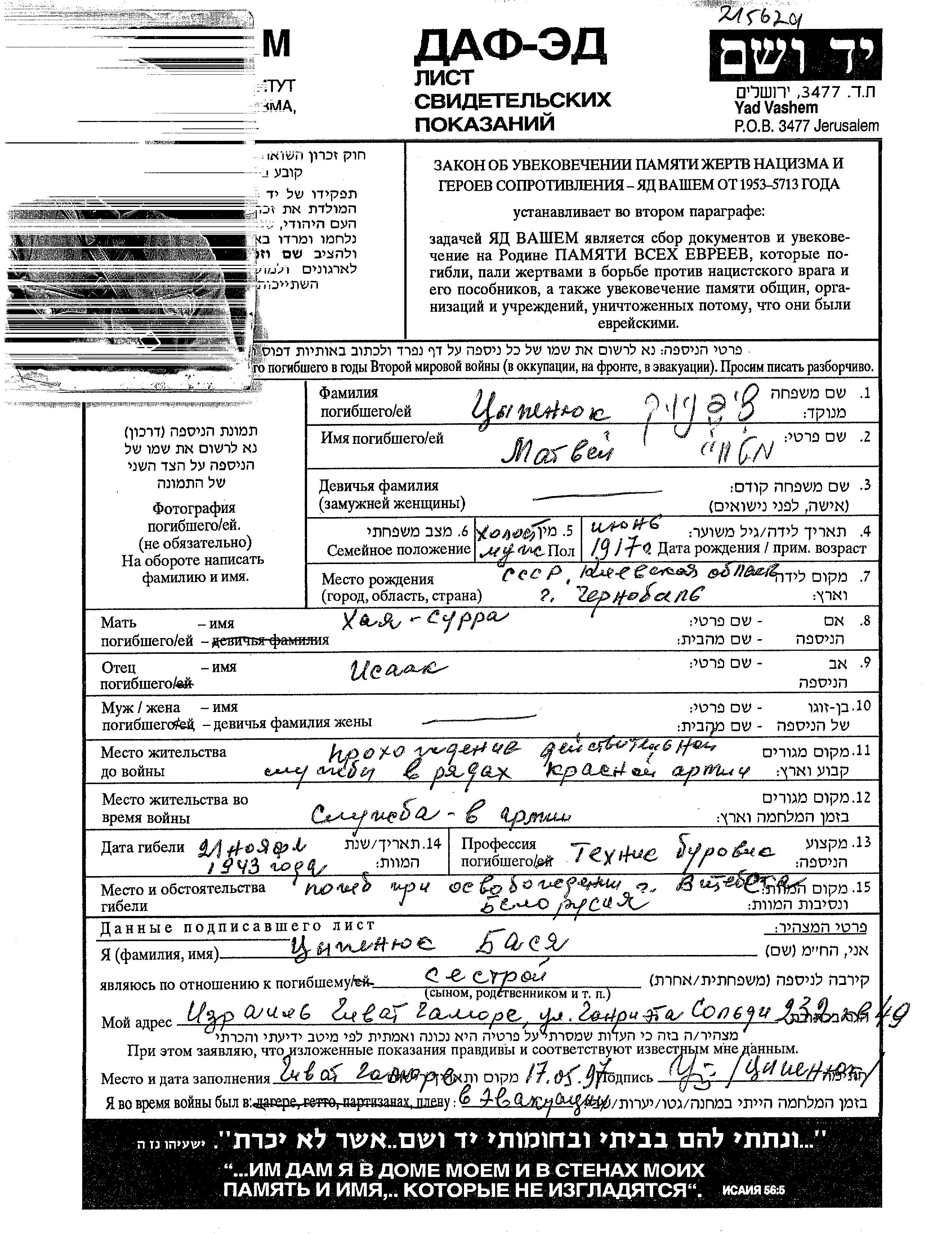 Яд Вашем - Листы свидетельских показаний Мемориального фонда