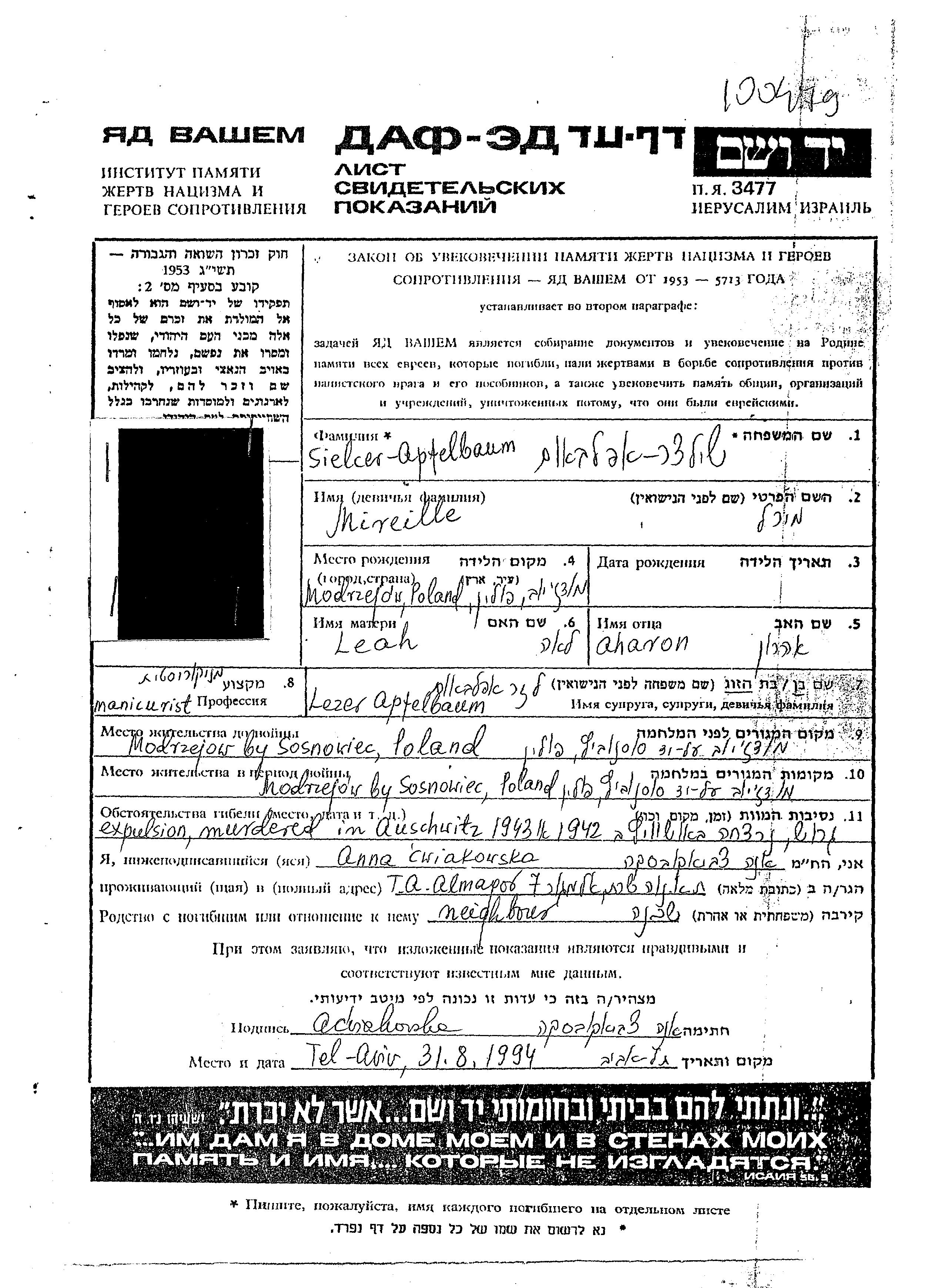 Апфельбаум Мирейле Мирл Моджеюв, Польша Лист свидетельских показаний