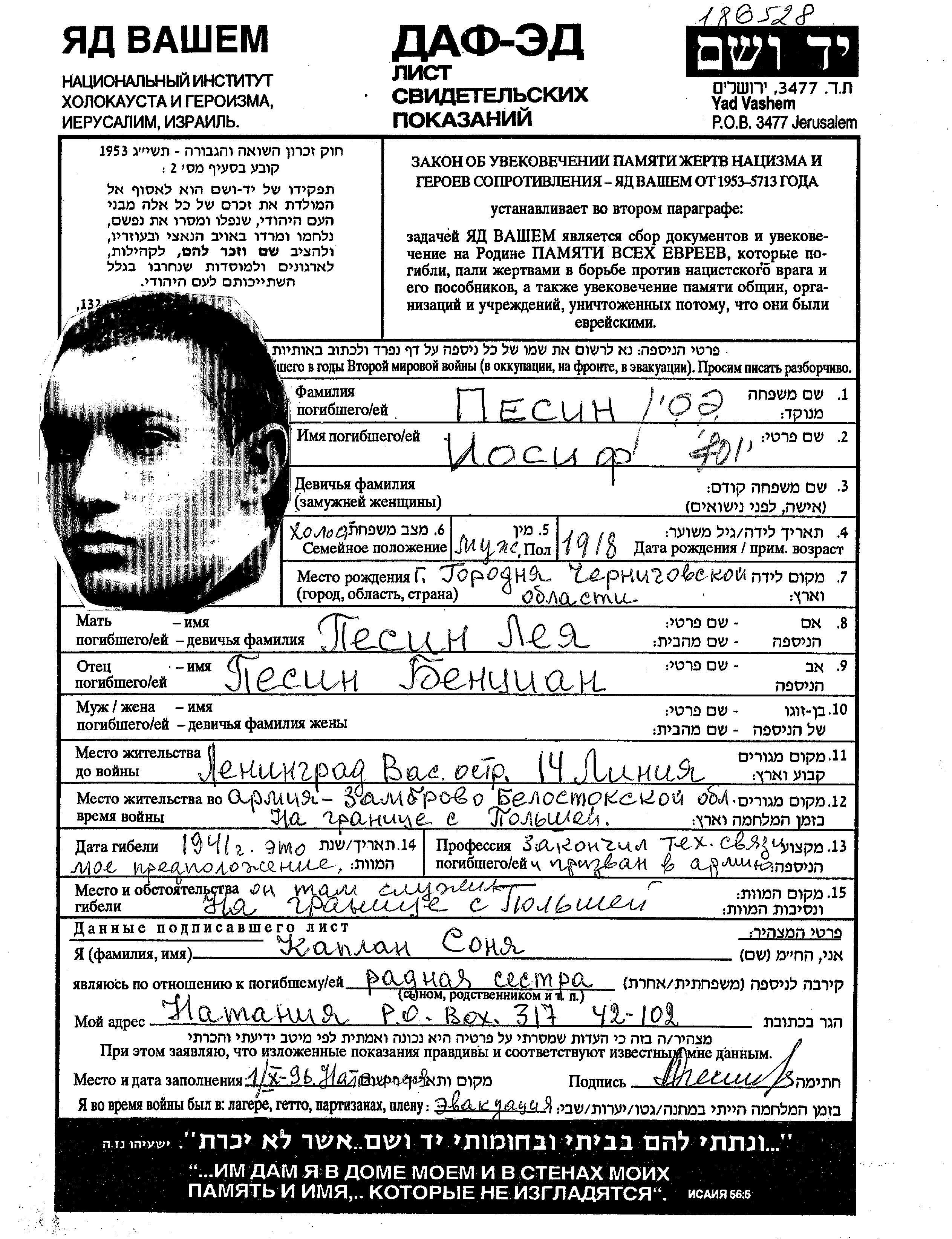 | Песин | Иосиф | 1918 | Ленинград, Россия (СССР) | Лист свидетельских показаний |