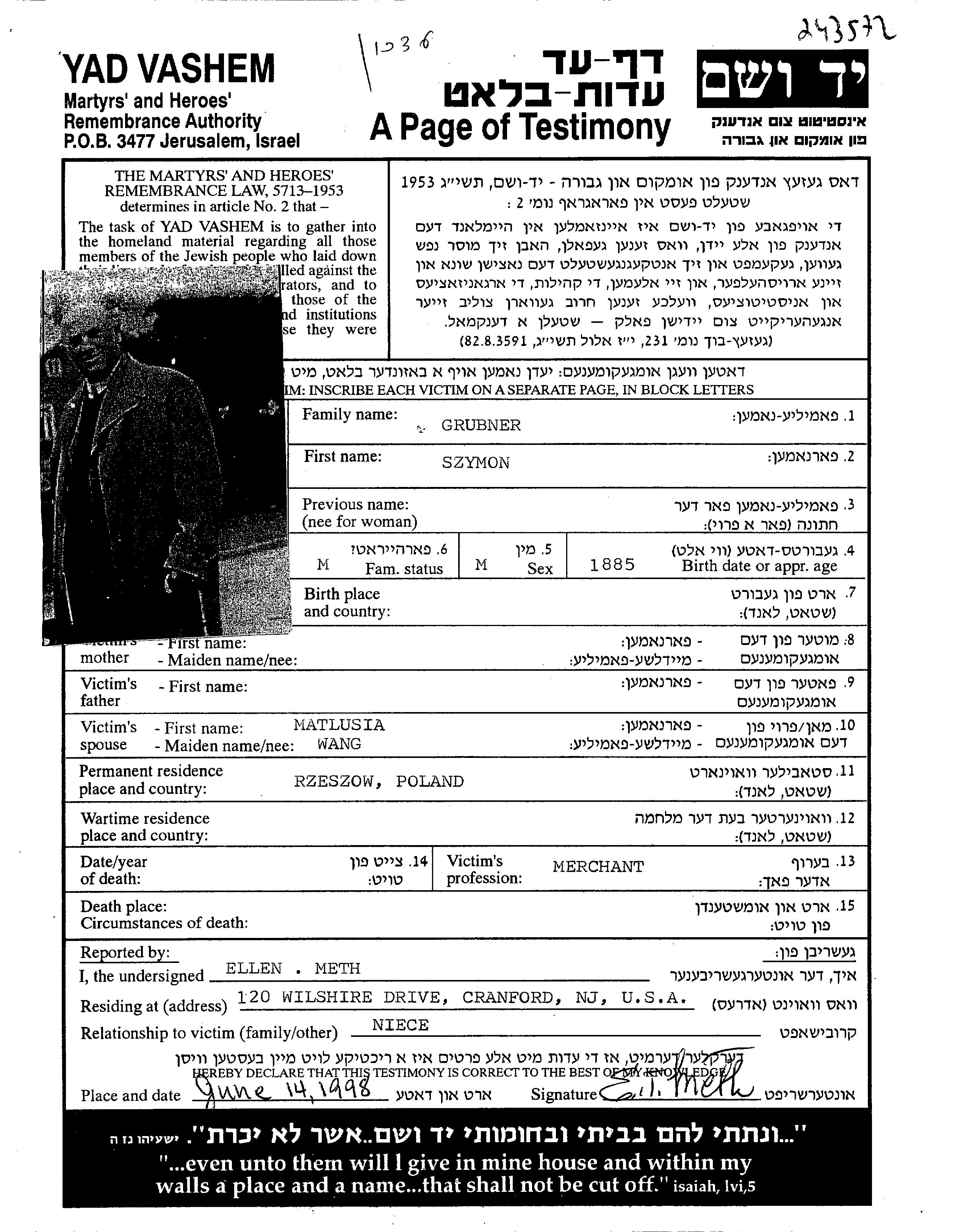 Грубнер Шимон 1885 Жешов, Польша Лист свидетельских показаний