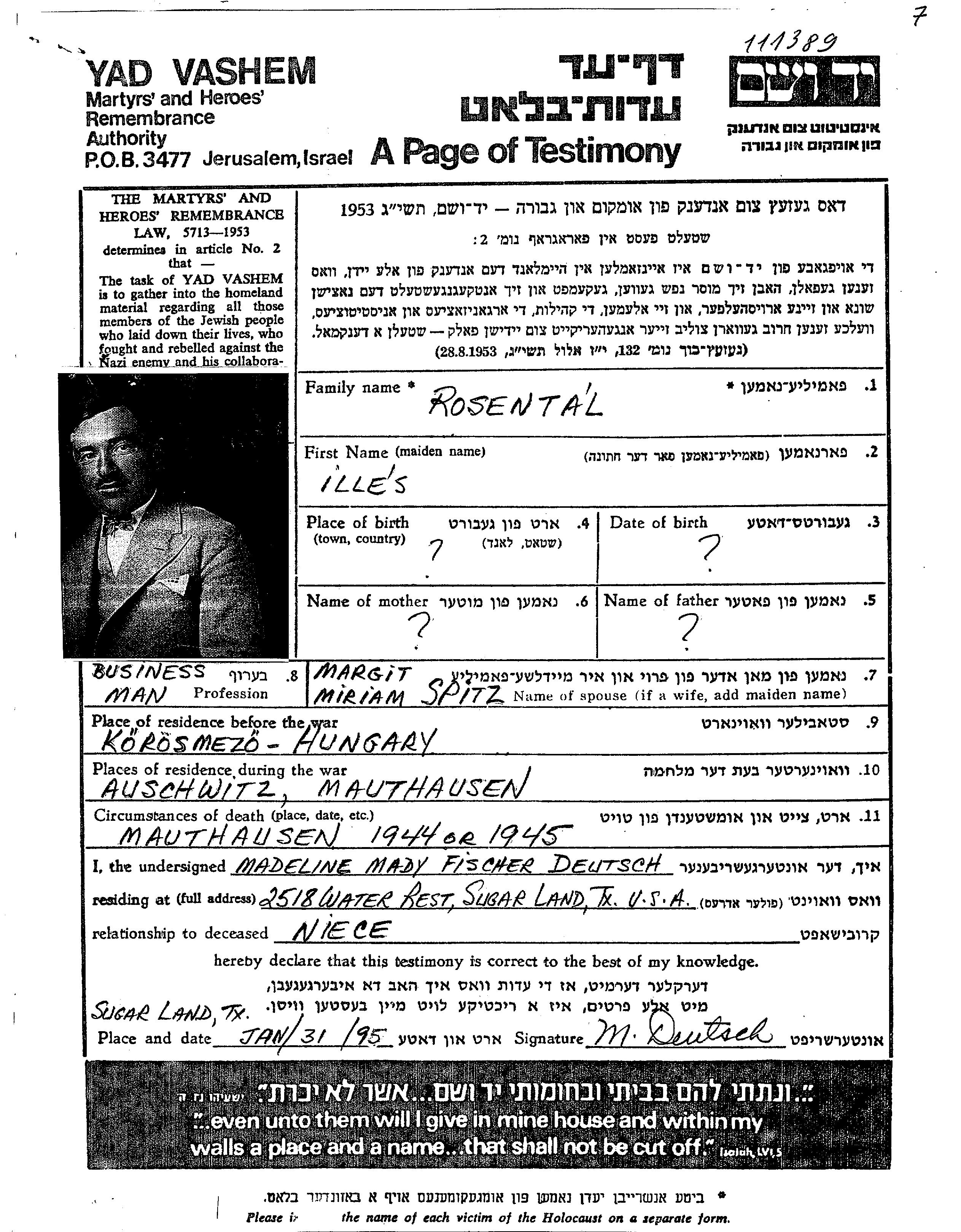 Розенталь | Иллеш Илеш | Кёрёшмезё, Чехословакия | Лист свидетельских показаний | |
