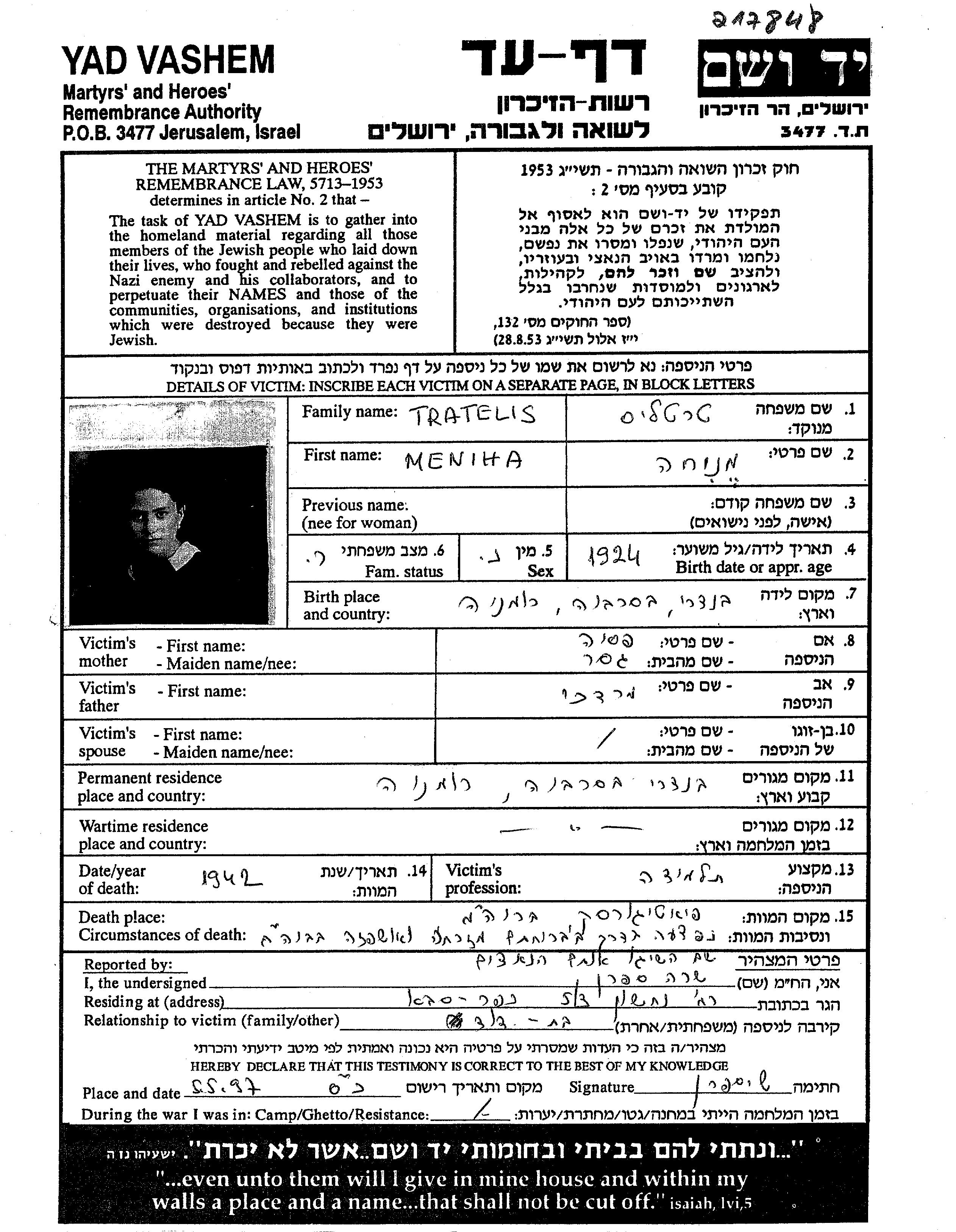 Мениха Трателис, место рождения: Тигина, Румыния. Место жительства до войны: Тигина, Румыния.