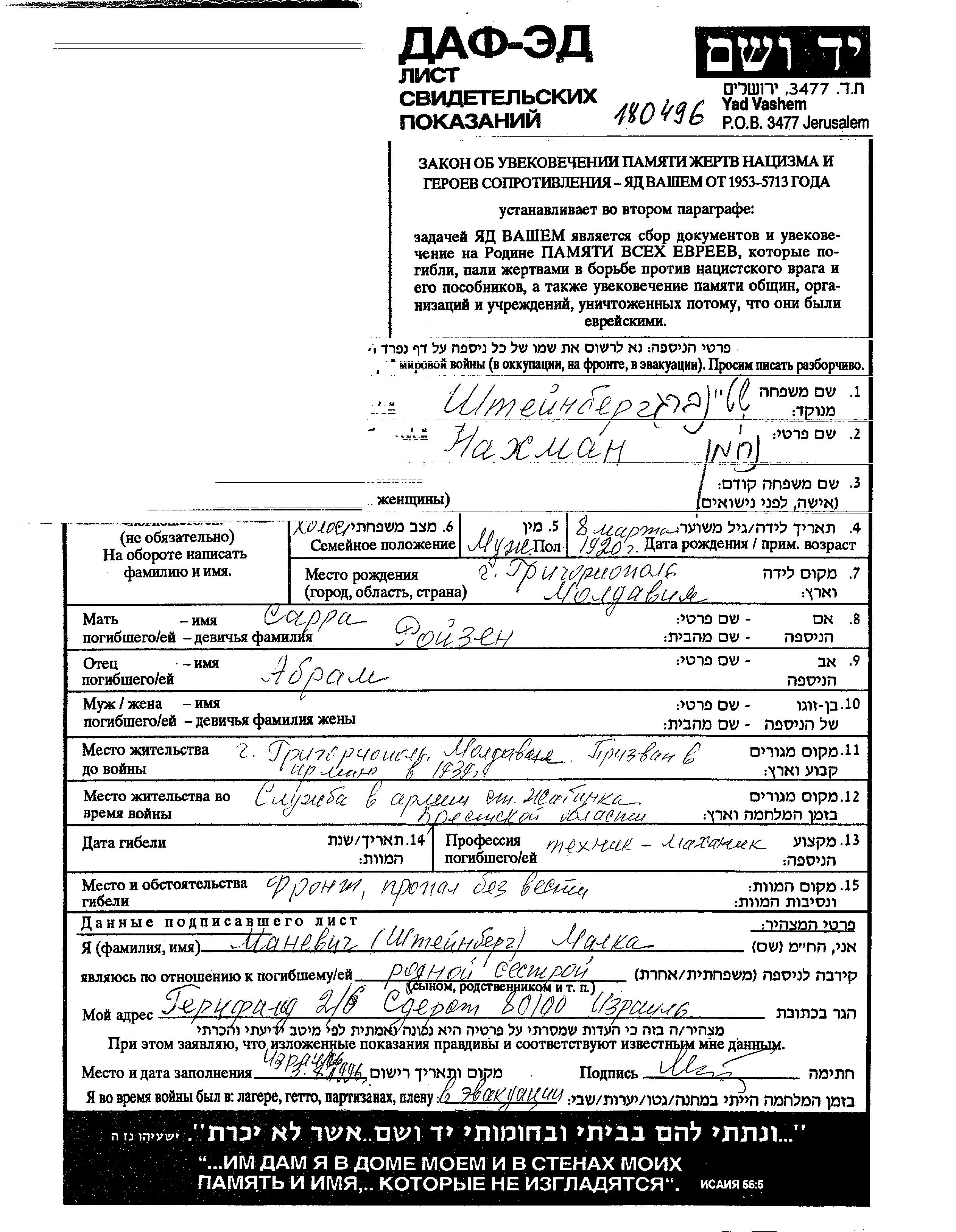 Штейнберг | Нахман | 1920 | Григориополь, Украина (СССР) | Лист свидетельских показаний |