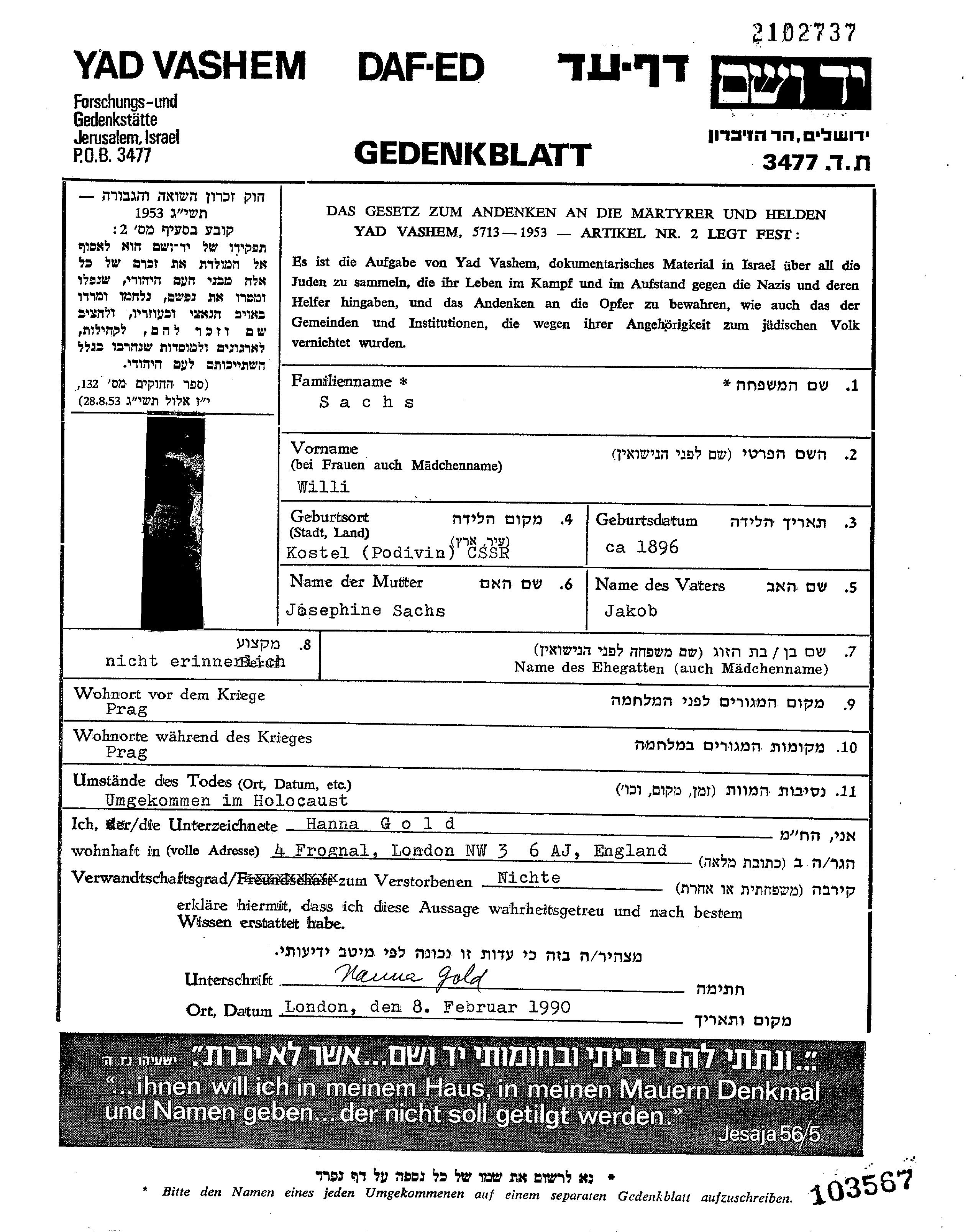 Захс Вилли Прага, Чехословакия Лист свидетельских показаний