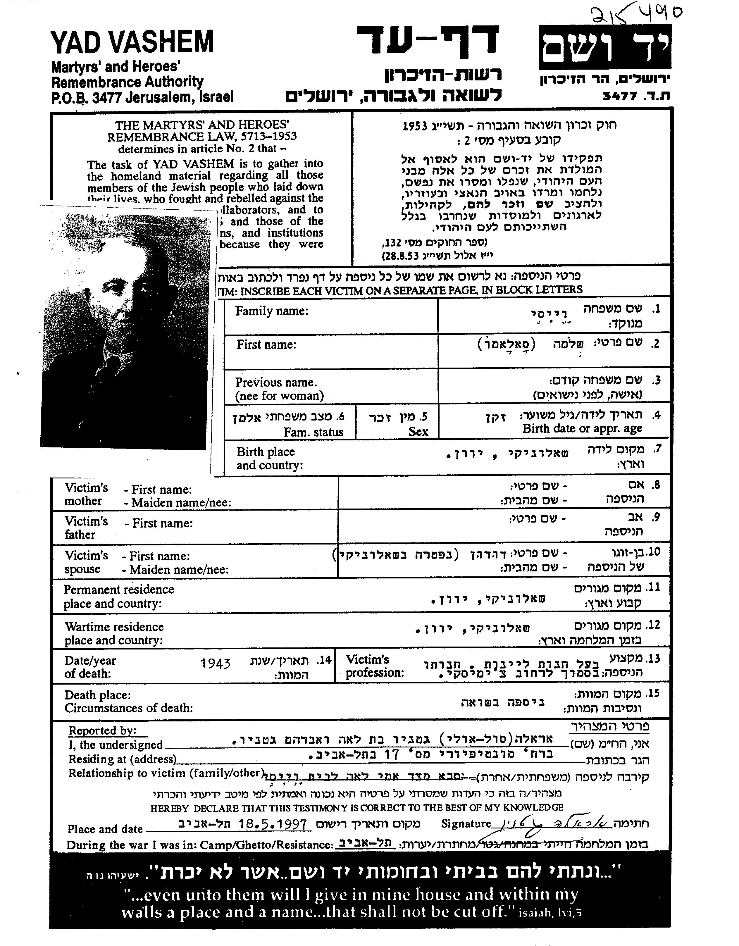 Вейси Шломо Салоники, Греция Лист свидетельских показаний