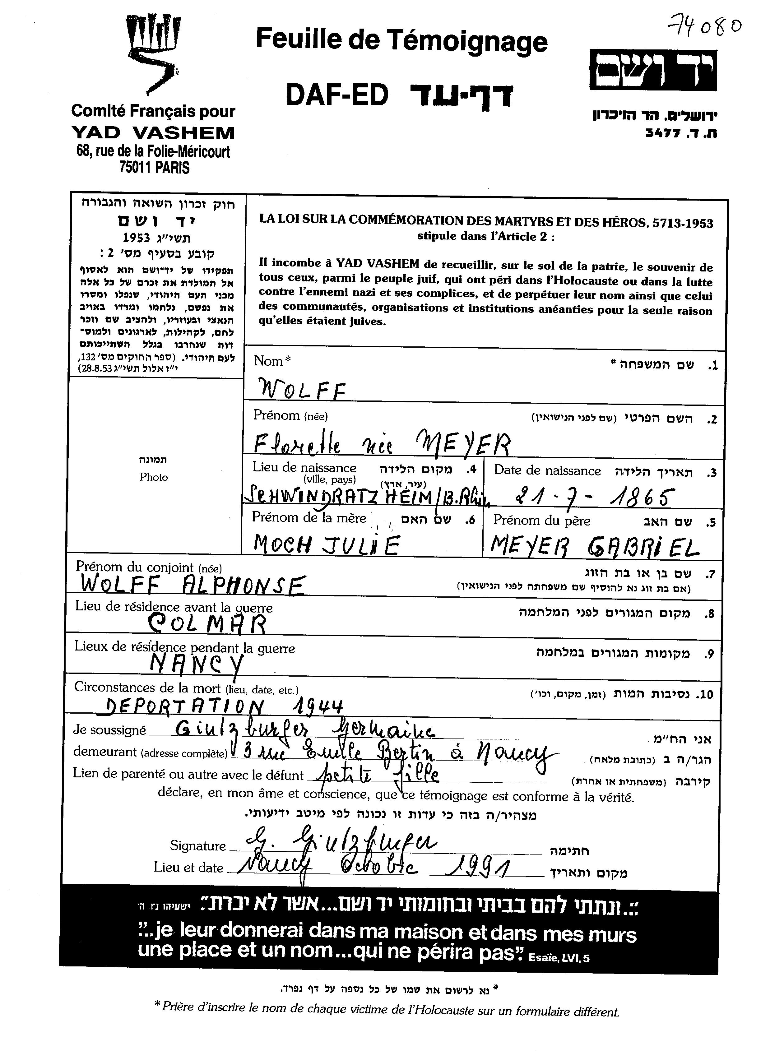 Флорет Вольф, девичья фамилия Мейер, место рождения: Франция. Отец: Габриэль, mать:Юли Золи, девичья фамилия Мох. Женат / замужем. Место жительства до войны: Кольмар, Франция. Место во время войны: Нанси, Франция.
