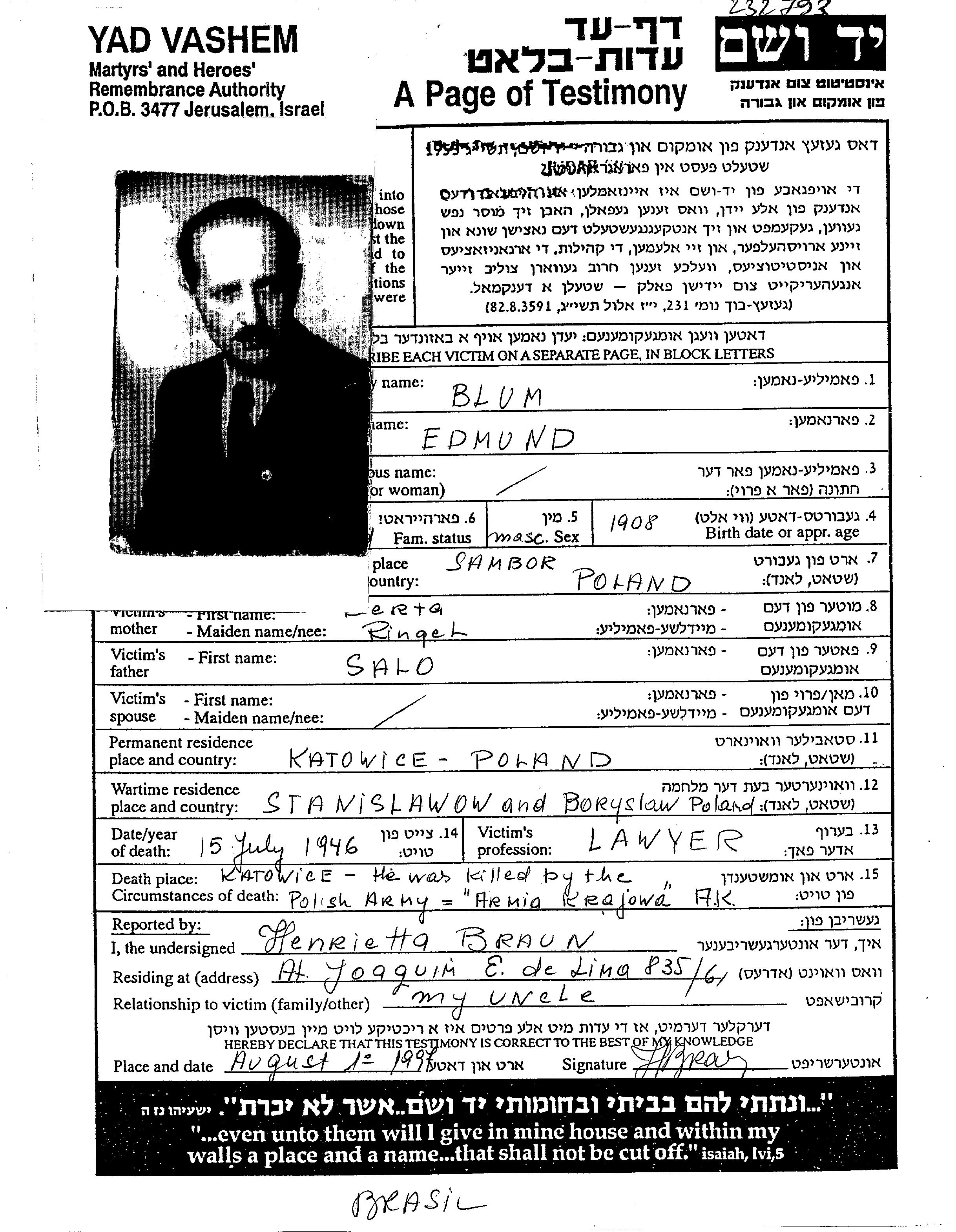 Блум | Эдмунд | 1908 | Катовице, Польша | Лист свидетельских показаний |