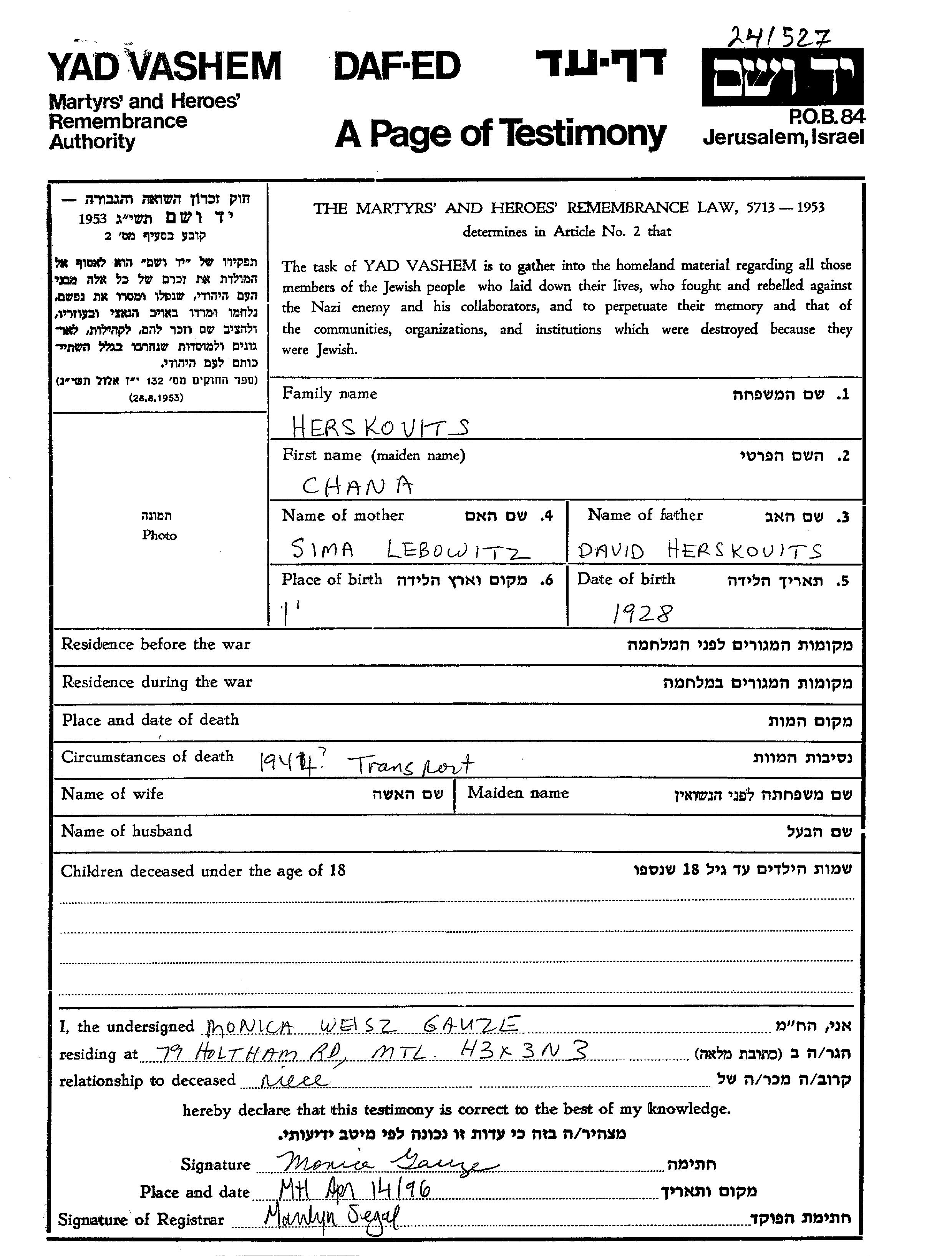 Яд Вашем - Листы свидетельских показаний Мемориального фонда