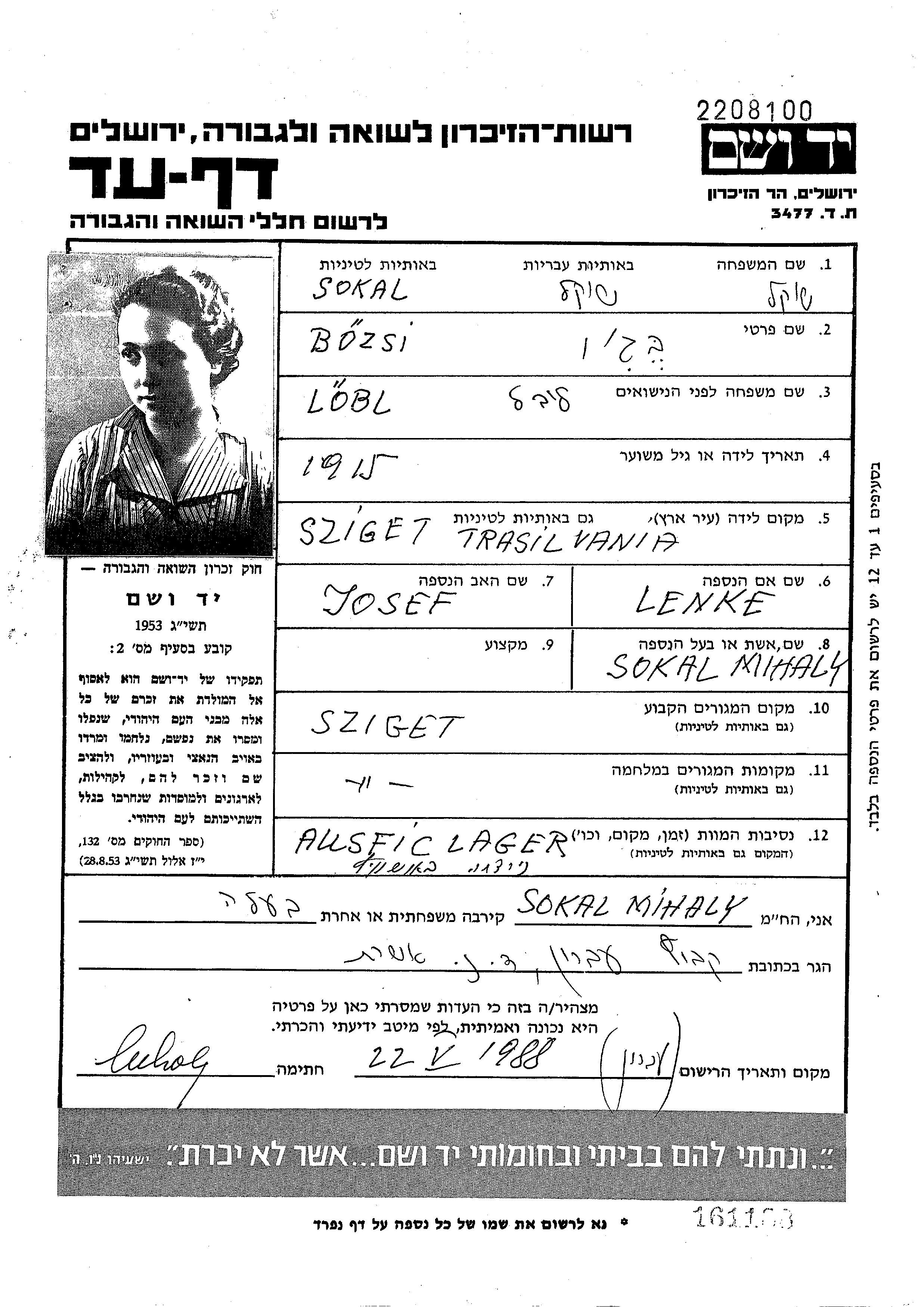 Сокаль | Божи | 1915 | Сигет, Румыния | Лист свидетельских показаний |