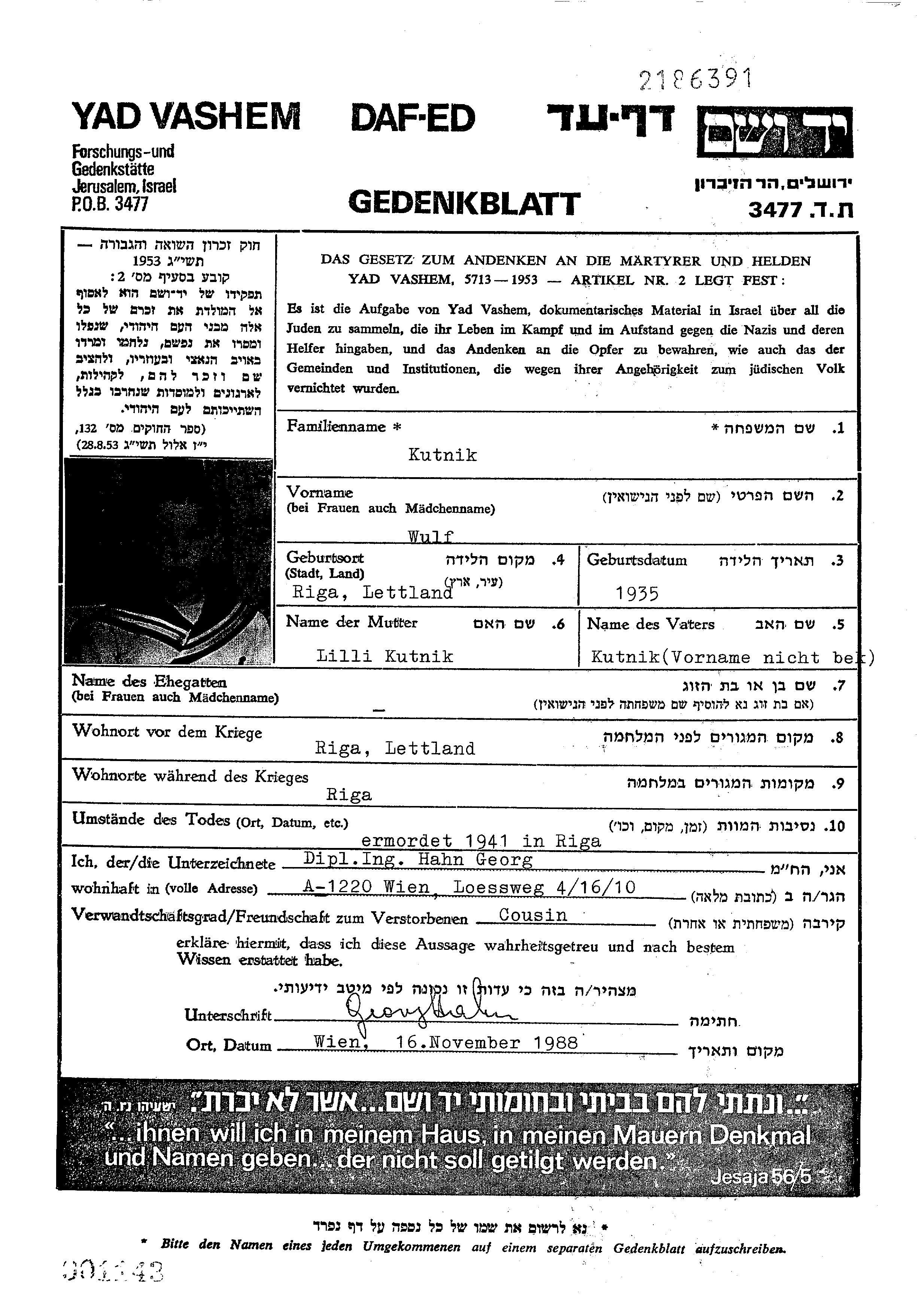 Вульф Кутник, место рождения: Рига, Латвия. Место жительства до войны: Рига, Латвия.
