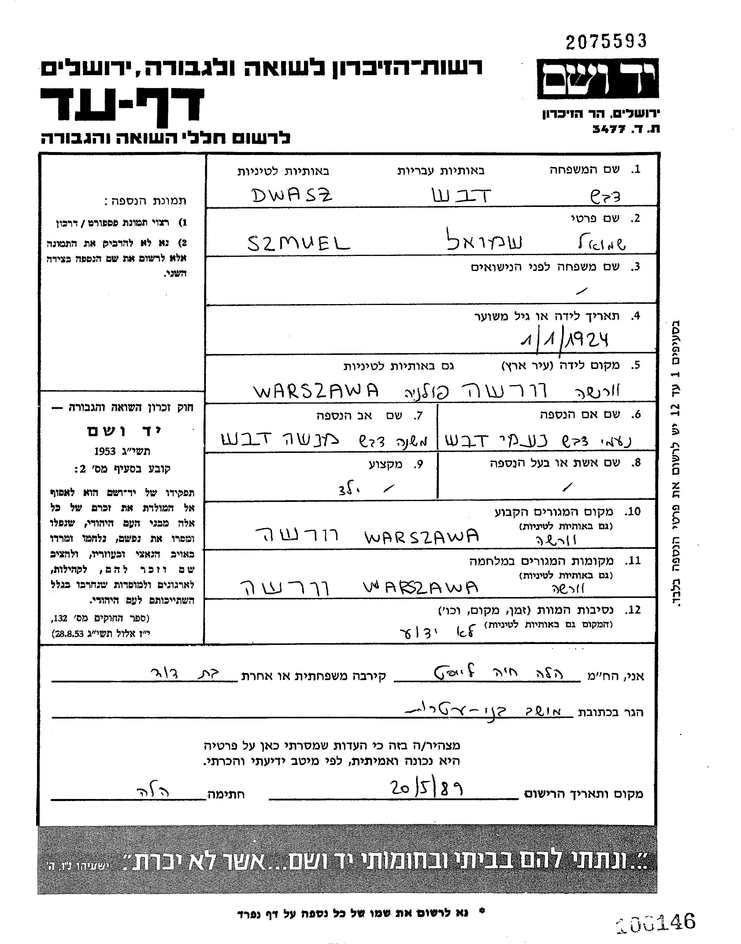 Дваш Шмуэль Варшава, Польша Лист свидетельских показаний
