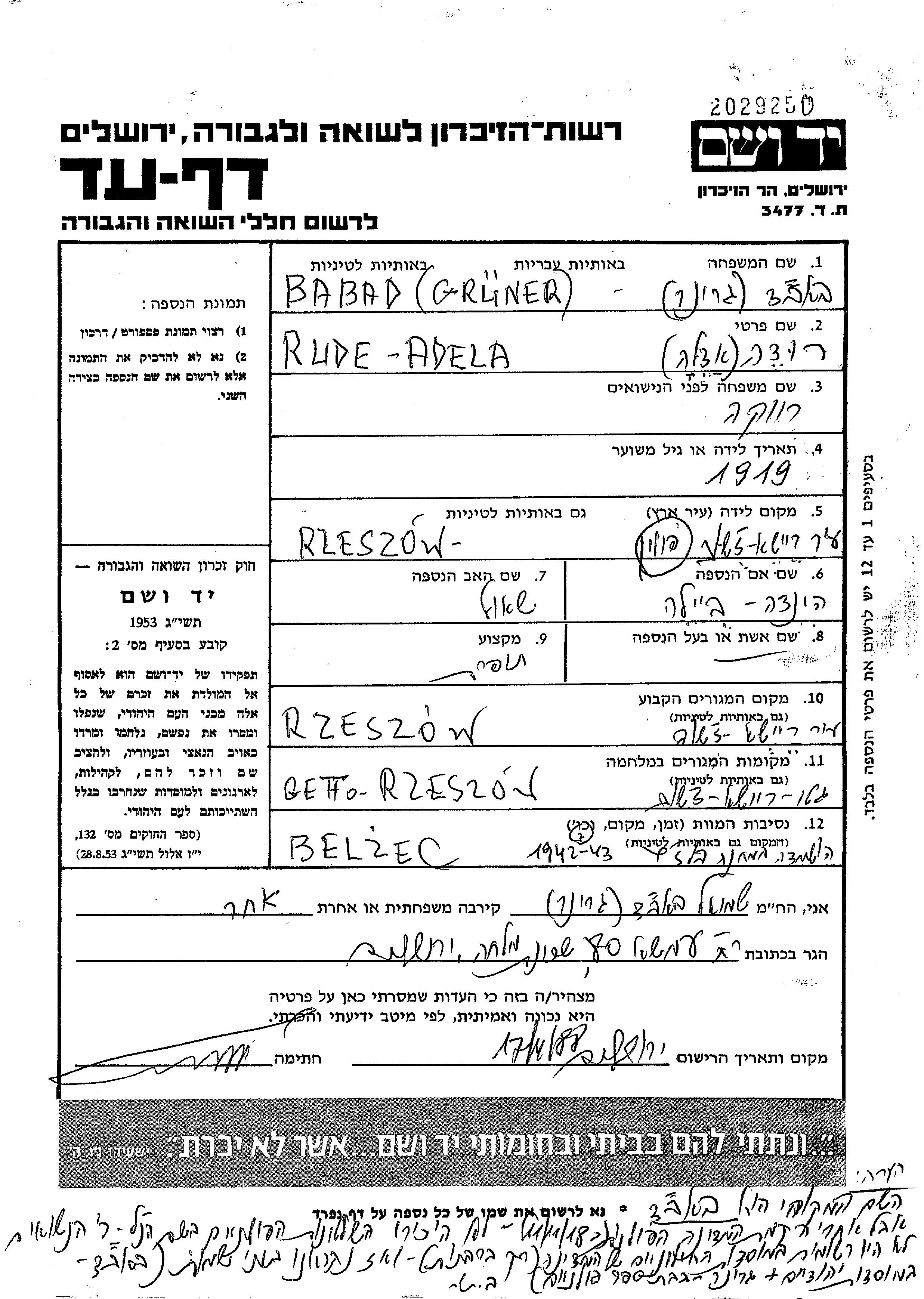 Грюнер Бабад Руде Адела 1919 Жешув, Польша Лист свидетельских показаний