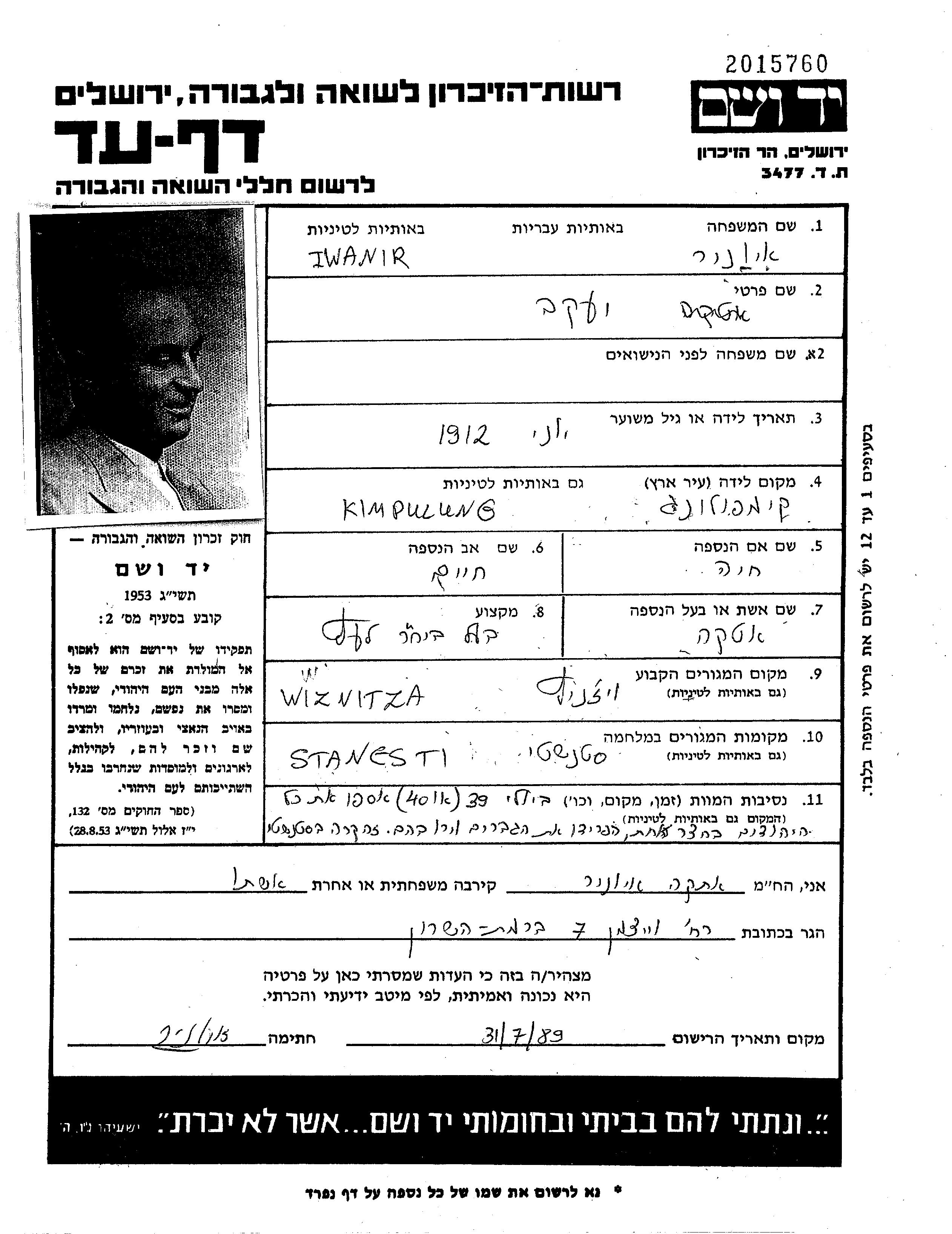 Иванир Яков 1912 Визниц, Румыния Лист свидетельских показаний