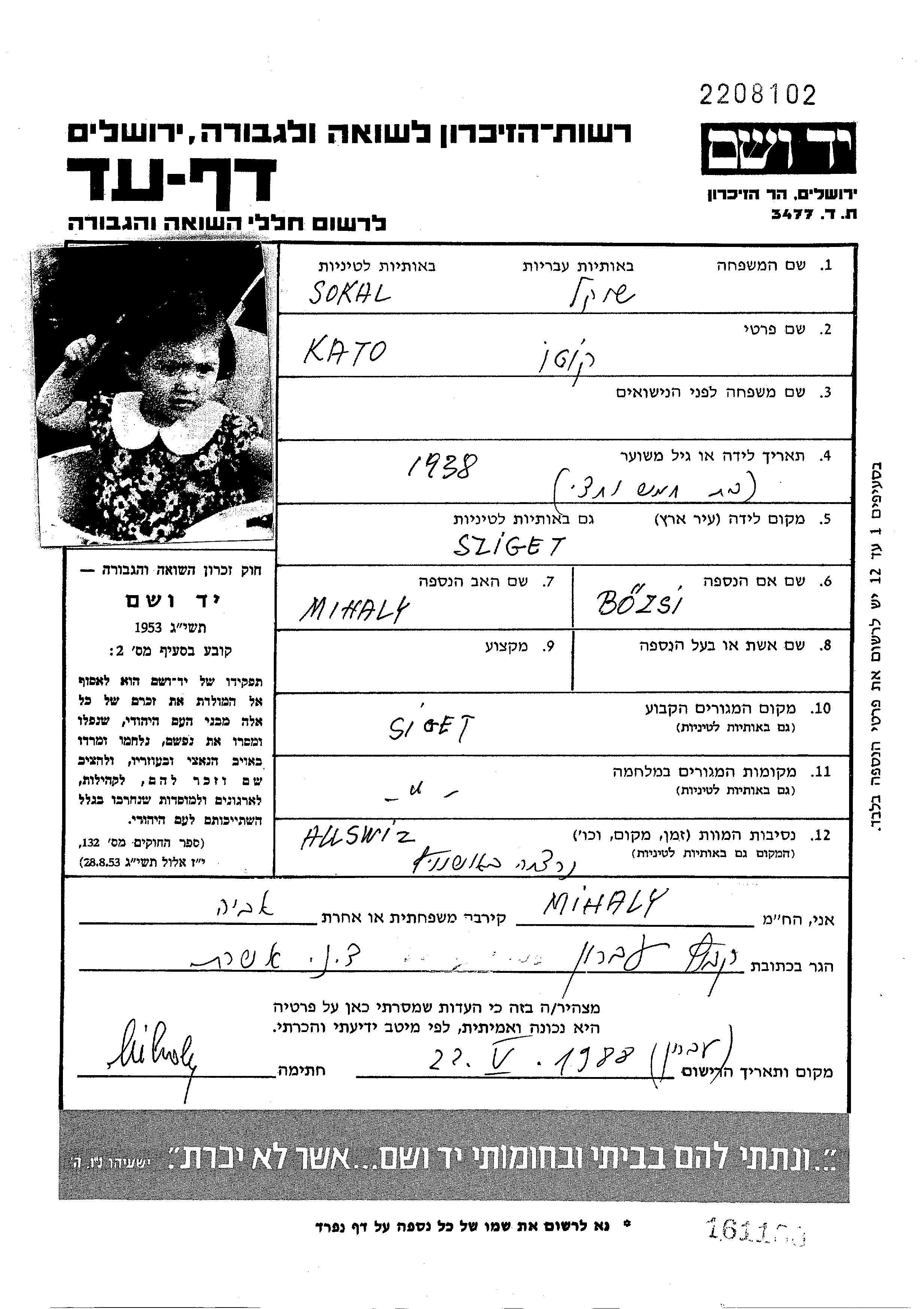 Като Сокаль, место рождения: Сигет, Румыния. Место жительства до войны: Сигет, Румыния.