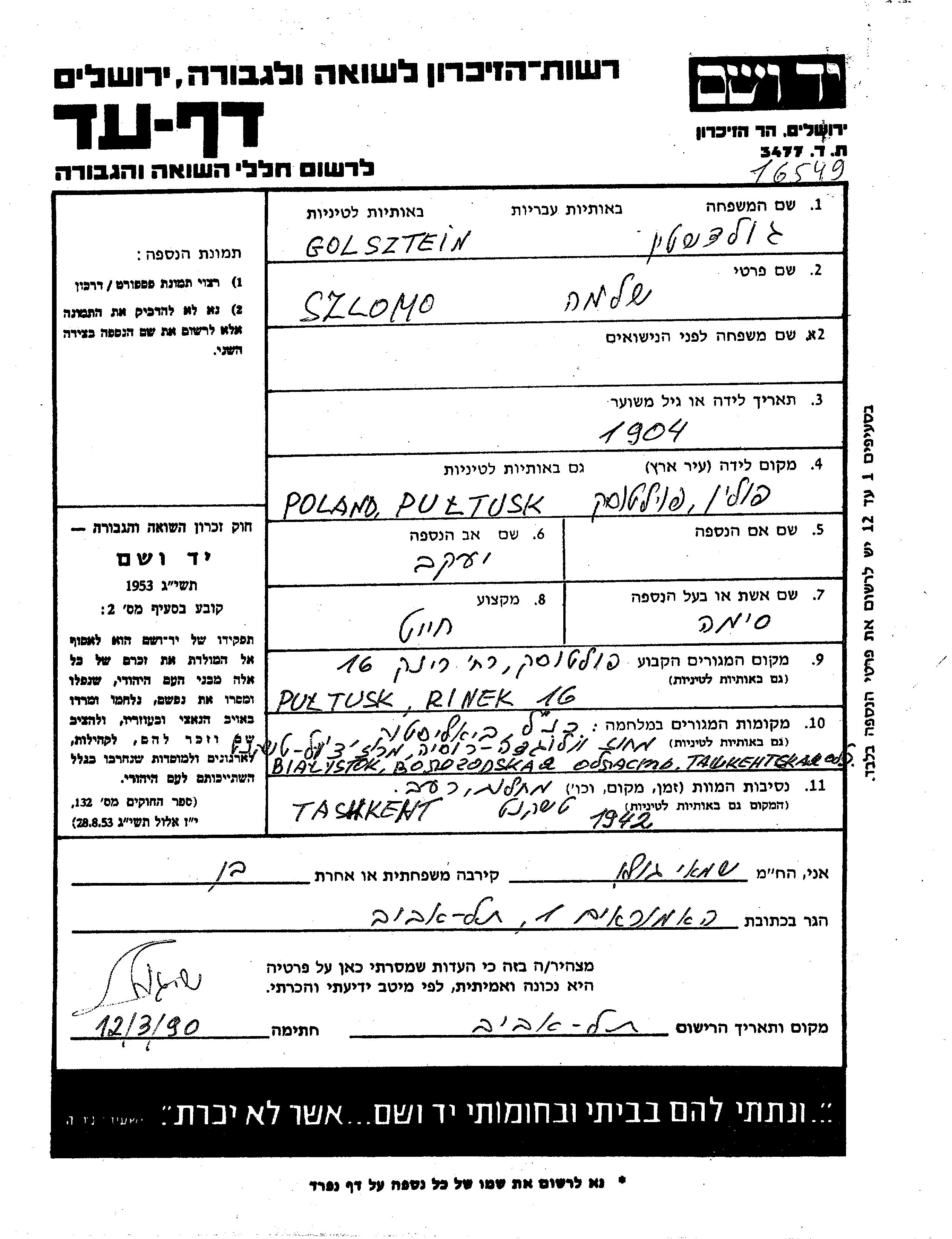 Шломо Гольдштейн, место рождения: Пултуск, Польша. Отец: Яков. Портной / портниха. Женат / замужем. Место жительства до войны: Пултуск, Польша. Место во время войны: Узбекистан (СССР).