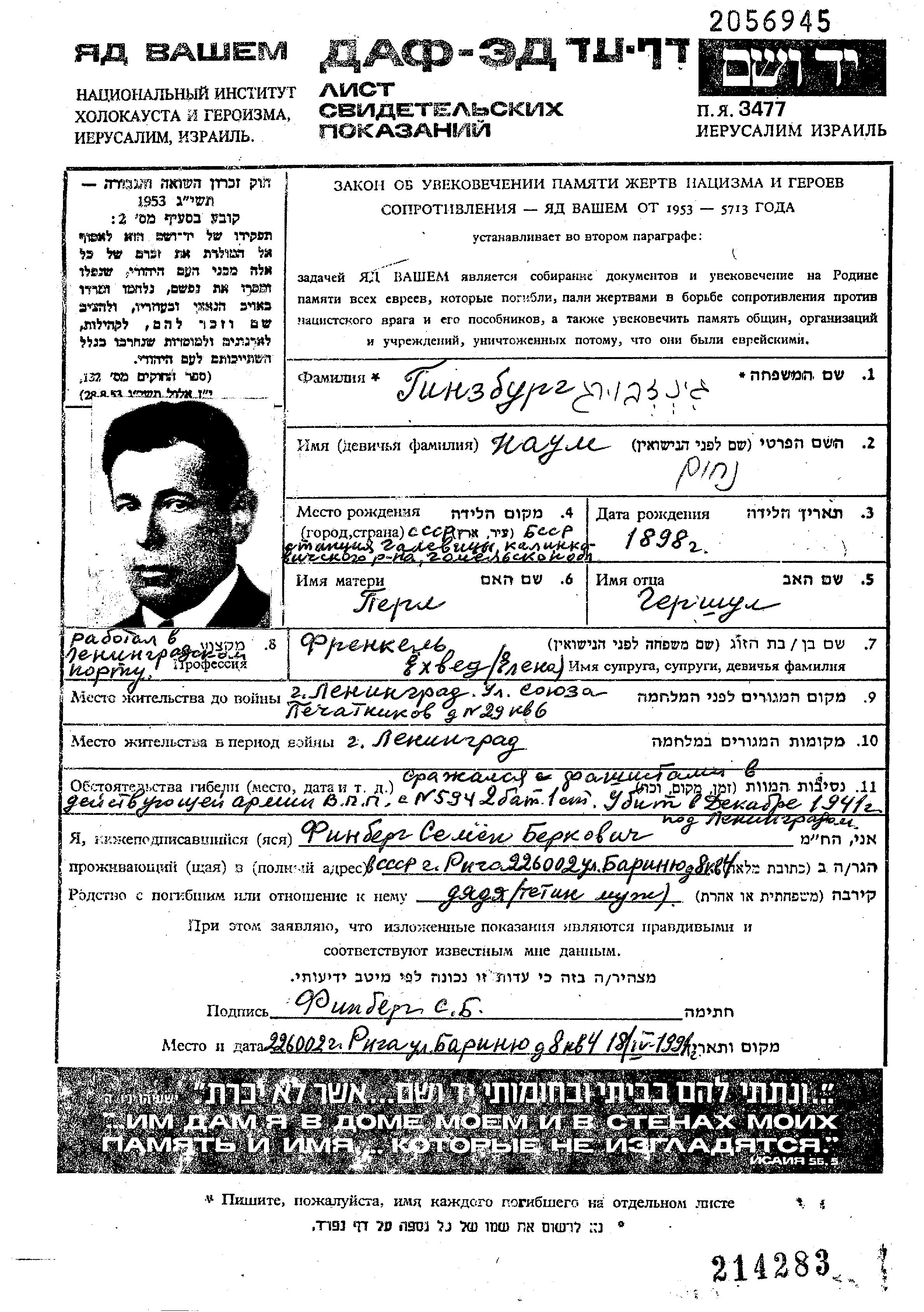 Гинзбург Наум 1898 Ленинград, Россия (СССР) Лист свидетельских показаний