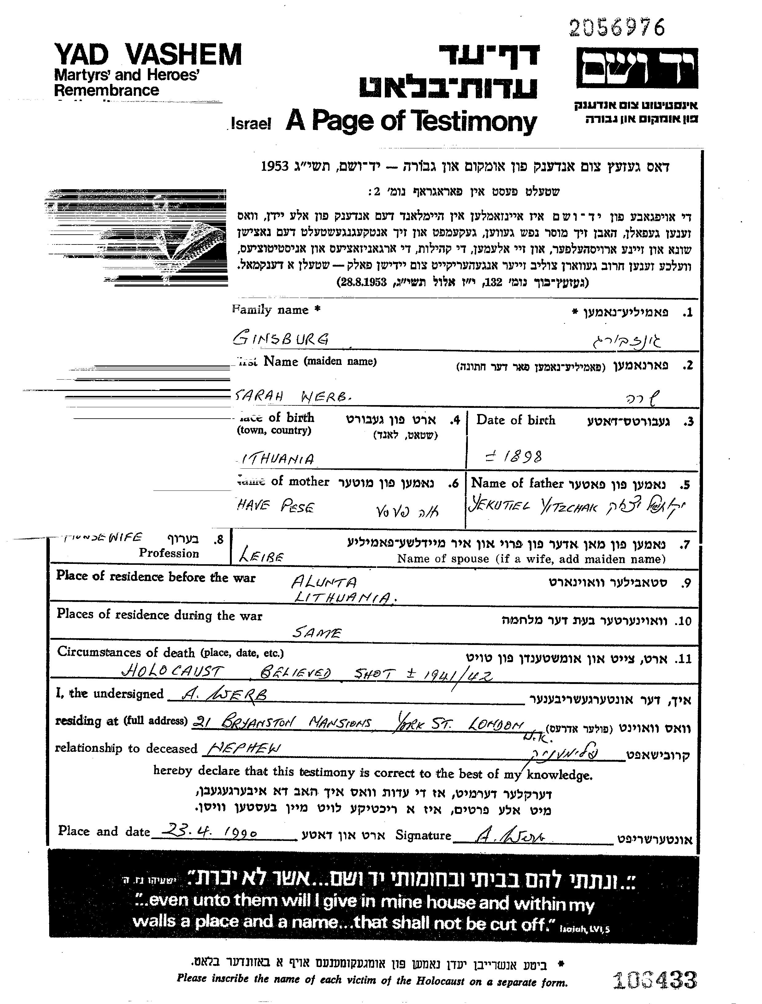 Гинзбург Сара 1898 Алунта, Литва Лист свидетельских показаний